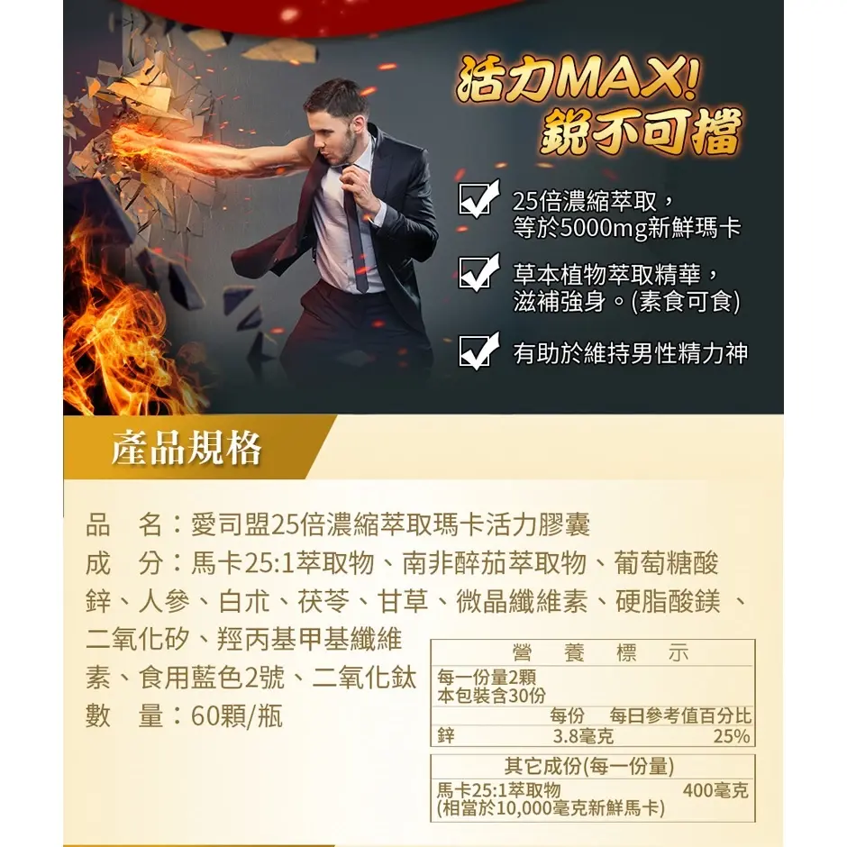 產品全名:愛司盟25倍濃縮萃取瑪卡活力膠囊