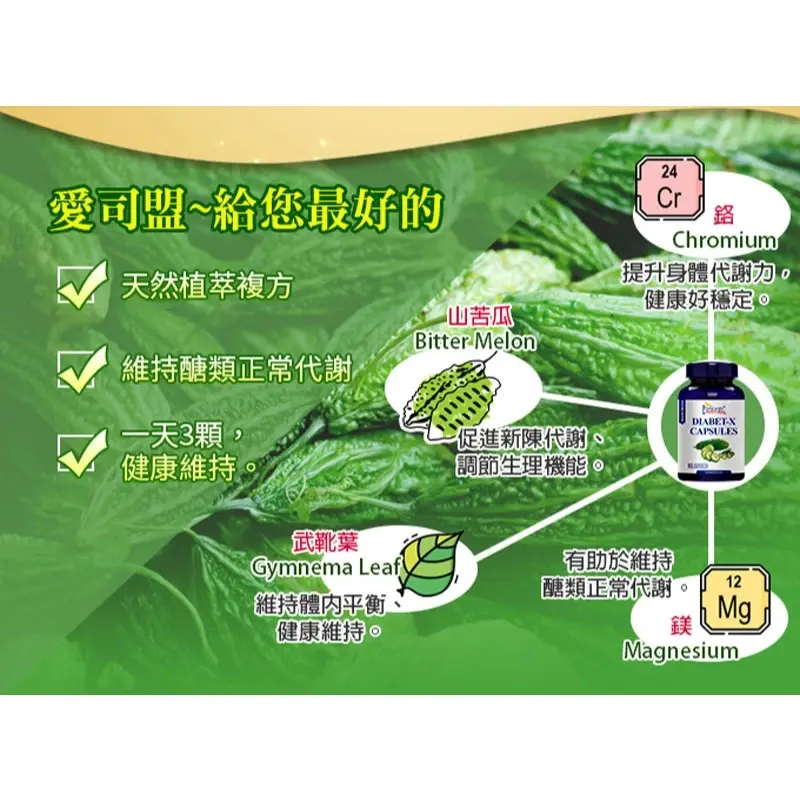 成 份 : 山苦瓜萃取物,武靴藤葉萃取物,明膠,麥芽糊精,人參,氧化鎂,啤酒酵母,舞菇(Grifola frondosa (Dicks : Fr. ) S. F. Gray)(子實體),秋葵,山桑子萃取物,紫花苜蓿葉,大蒜,洋蔥,葫蘆巴籽,肉桂,芹菜,蘋果醋,甘油,硬脂酸鎂,純水,二氧化矽,鉻酵母。