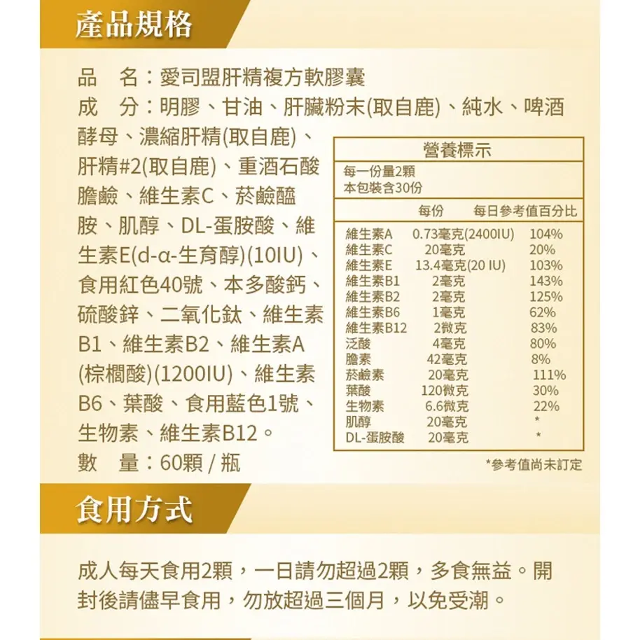 成份:明膠、甘油、肝臟粉末(取自鹿)、純水、啤酒酵母、濃縮肝精(取自鹿)、肝精#2(取自鹿)、重酒石酸膽鹼、維生素C、菸鹼醯胺、肌醇、DL-蛋胺酸、維生素E(d-α-生育醇)(10IU)、食用紅色40號、本多酸鈣、硫酸鋅、二氧化鈦、維生素B1、維生素B2、維生素A(棕櫚酸)(1200IU)、維生素B6、葉酸、食用藍色1號、生物素、維生素B12。