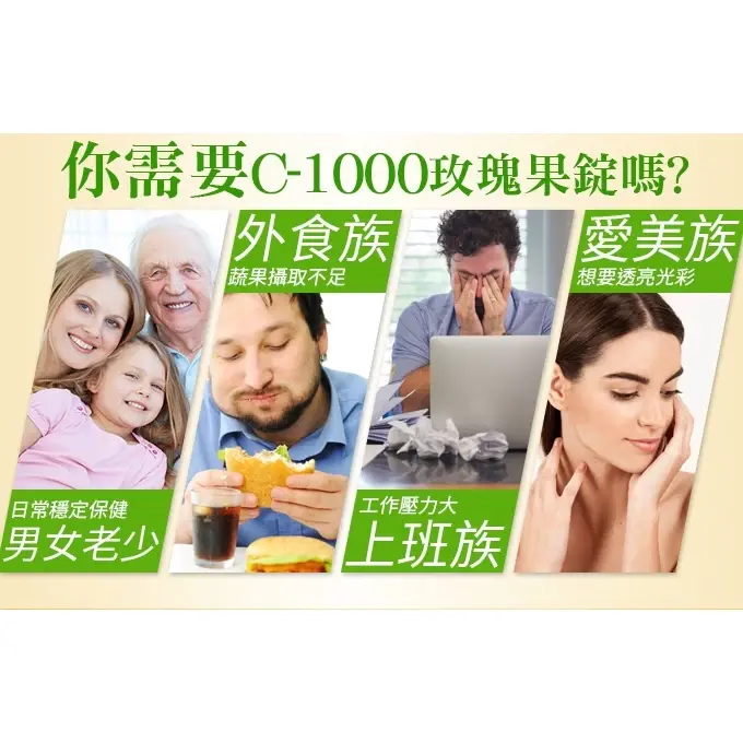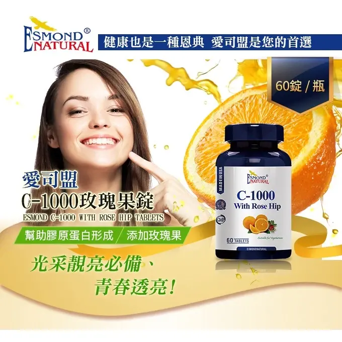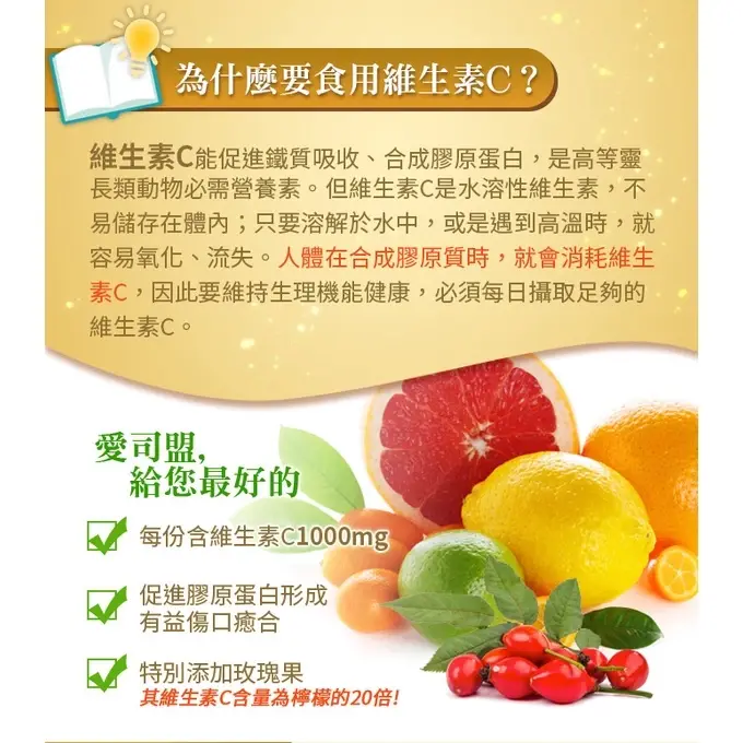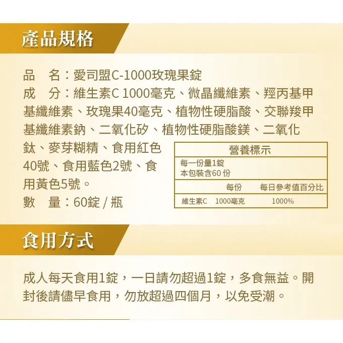 成份:維生素C, 微晶纖維素, 羥丙基甲基纖維素, 玫瑰果, 植物性硬脂酸, 交聯羧甲基纖維素鈉, 二氧化矽, 植物性硬脂酸鎂, 二氧化鈦, 麥芽糊精, 食用紅色40號, 食用藍色2號, 食用黃色5號。