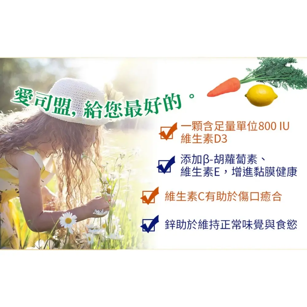 成份:微晶纖維素,維生素C,明膠,檸檬酸鋅,硬脂酸鎂,維生素E,二氧化矽,β-胡蘿蔔素,二氧化鈦,維生素D3。