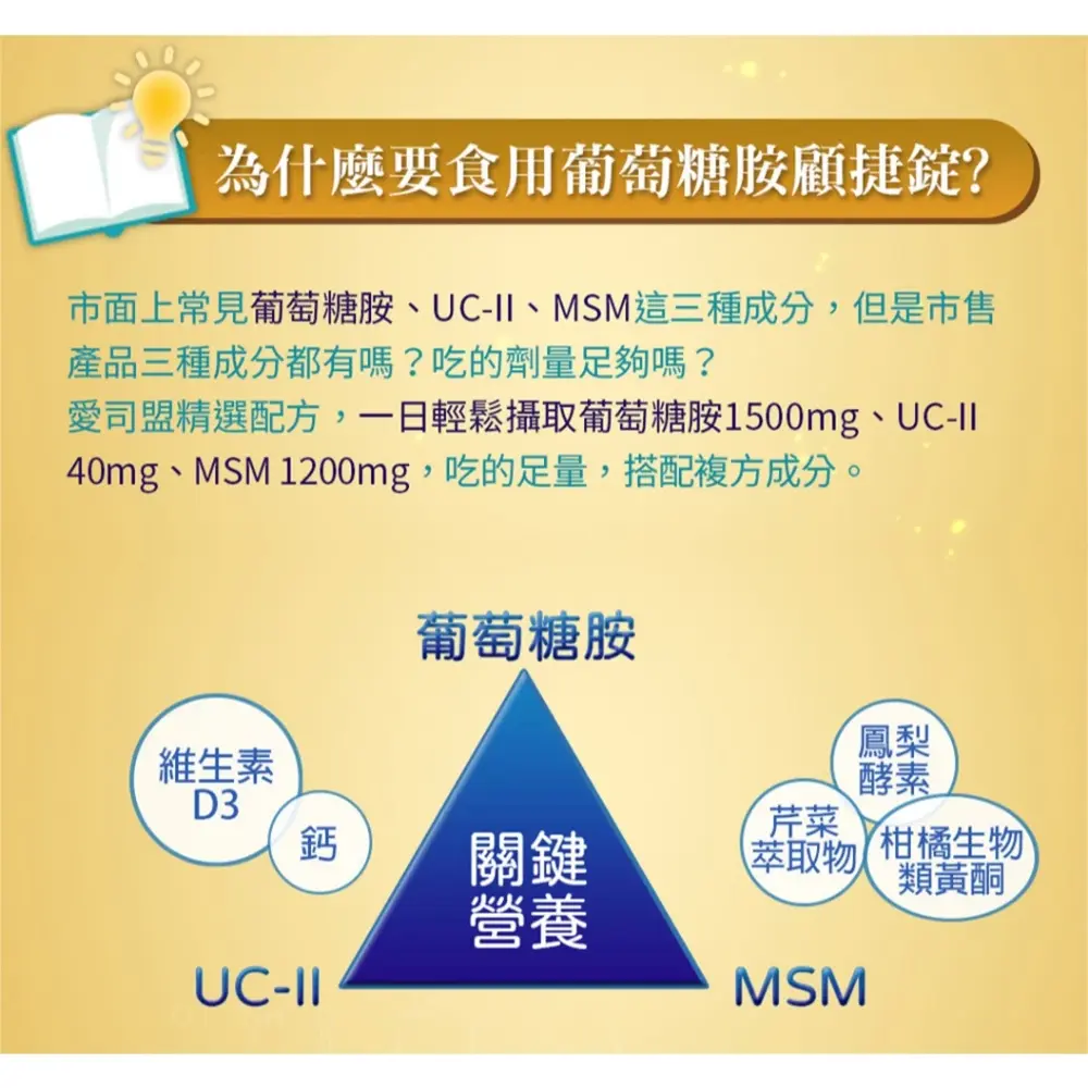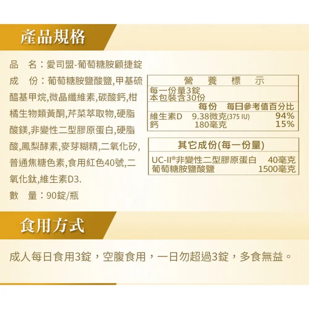 葡萄糖胺鹽酸鹽,甲基硫醯基甲烷, 微晶纖維素,碳酸鈣,柑橘生物類黃酮,芹 菜萃取物,硬脂酸鎂,非變性二型膠原蛋 白,硬脂酸,鳳梨酵素,麥芽糊精,二氧化 矽,普通焦糖色素,食用紅色40號,二氧 化鈦,維生素D3.