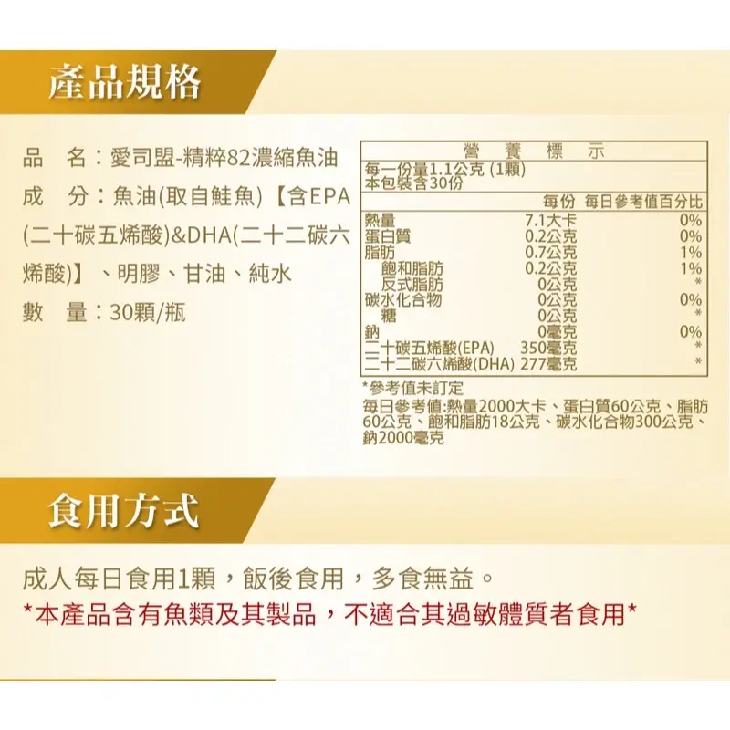 魚油(取自鮭魚)【含EPA(二十碳五烯 酸) & DHA(二十二碳六烯酸)】,明膠, 甘油,純水