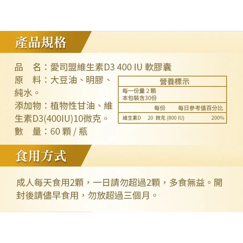 產品全名: 愛司盟維生素D3 400IU軟膠囊
