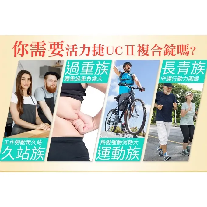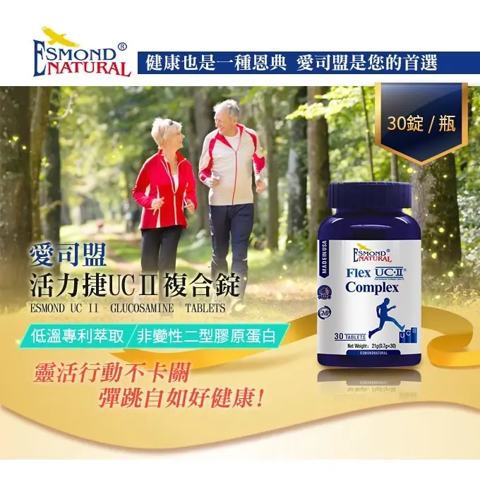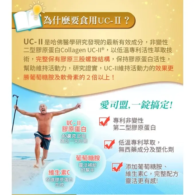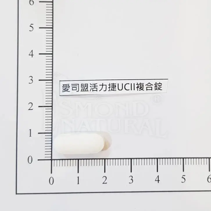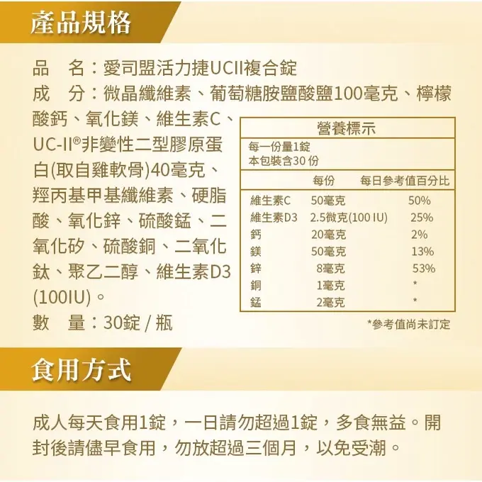 成份:微晶纖維素, 葡萄糖胺鹽酸鹽100毫克, 檸檬酸鈣, 氧化鎂, 維生素C, UC-II®非變性二型膠原蛋白(取自雞軟骨)40毫克, 羥丙基甲基纖維素, 硬脂酸, 氧化鋅, 硫酸錳, 二氧化矽, 硫酸銅, 二氧化鈦, 聚乙二醇, 維生素D3 (100IU)。