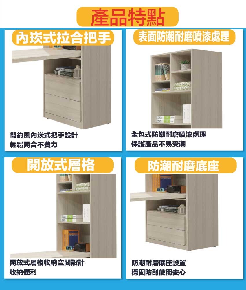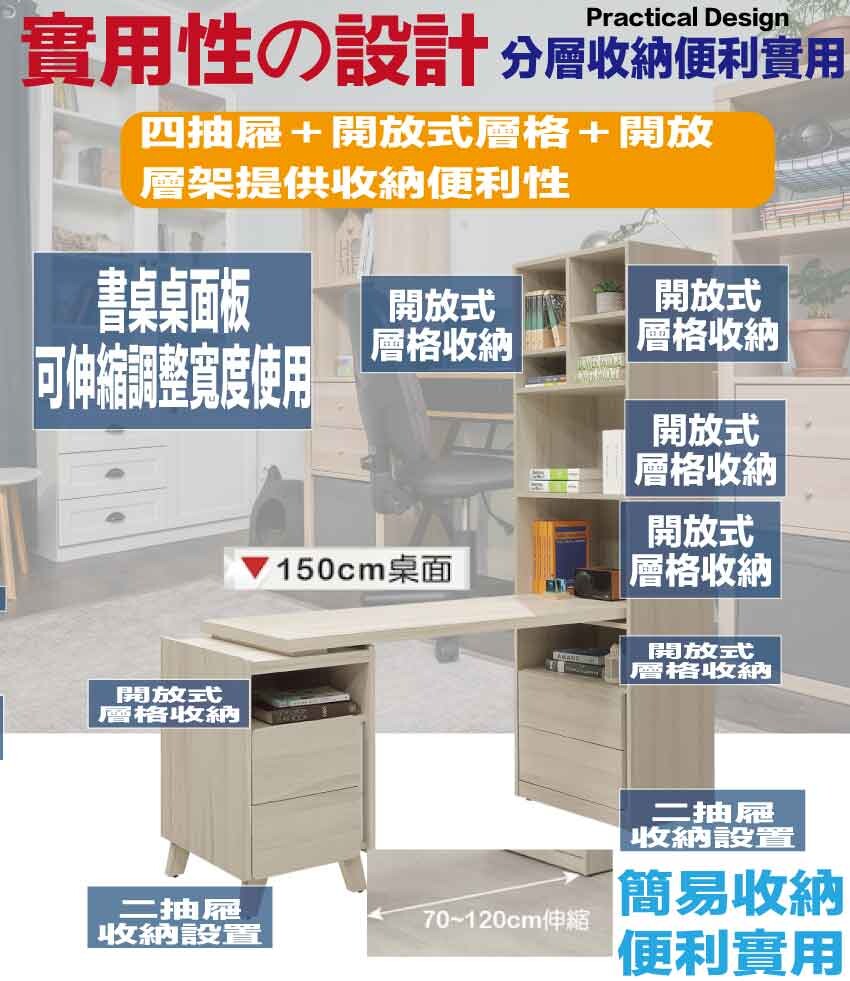 搭配採用四抽屜+可伸縮桌面板+開放層格等收納空間設計