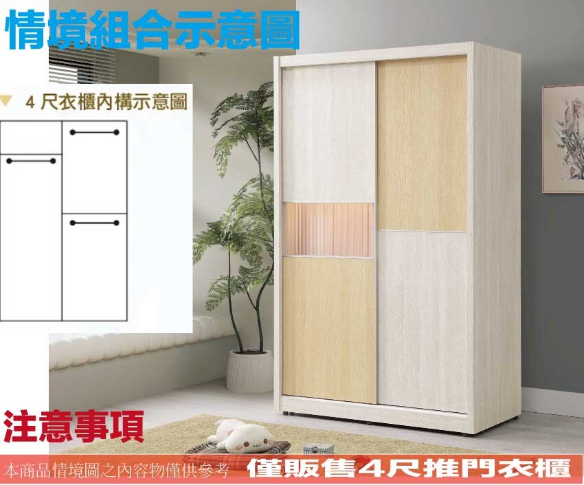 【綠家居】菲可雙色4尺推門玻璃衣櫃 木紋雙色系+安心材質製造,使用放心+搭配居家更便利,採用防蛀木心板+防潮耐磨底座+五金滑軌結構+強化玻璃門片等安心材質製造 ,外層採用防潮耐磨噴漆處理搭配採用推門櫃+吊衣桿+單抽屜+內開放多層格等收納空間設計,全由專人配送到家,專業安心服務,替你省下更多時間!