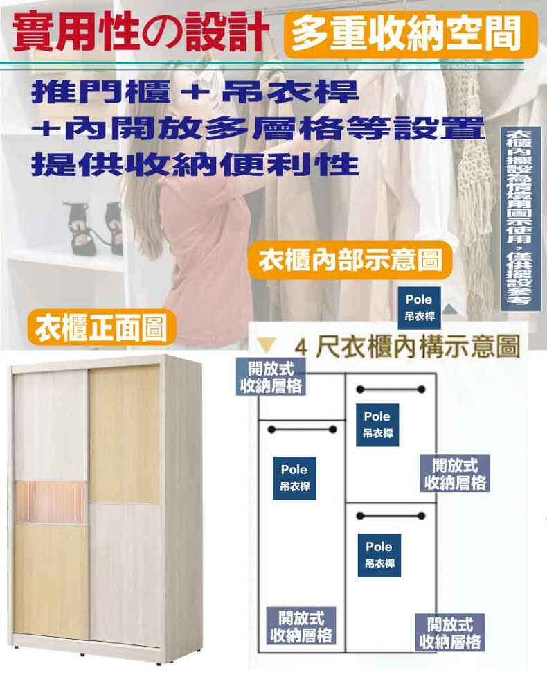 搭配採用推門櫃+吊衣桿+單抽屜+內開放多層格等收納空間設計