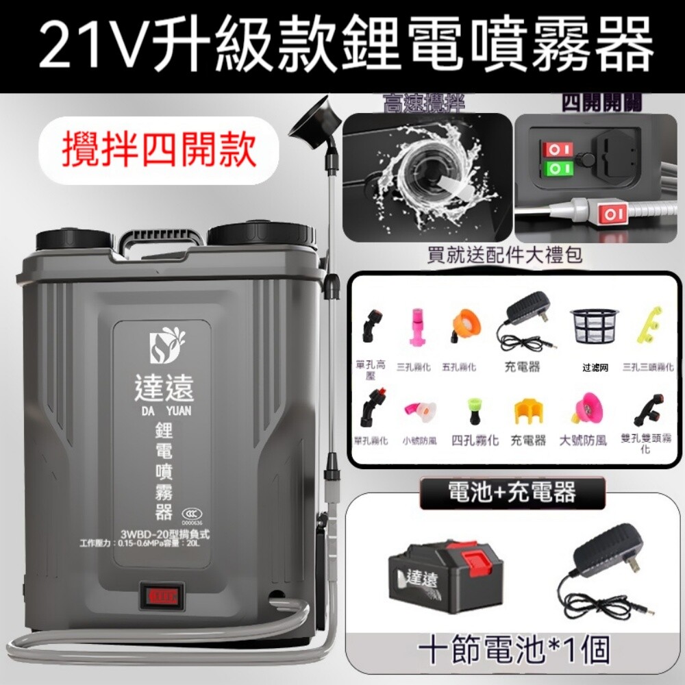 產品名稱:插拔電池攪拌噴霧器 產品材質:優質加厚工業級PP 軟管參數:1.2米優質防凍軟管 電池類型:21Ⅴ聚能輕便鋰電池 充電器:21V智能快充型 噴杆參數:約47cm伸80cm 容量:20L 產品毛重:3-5KG