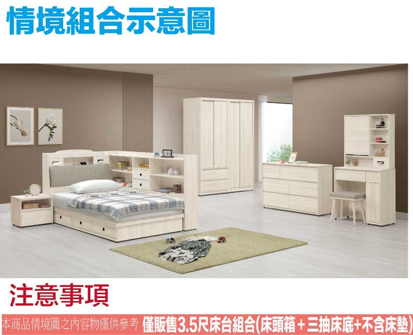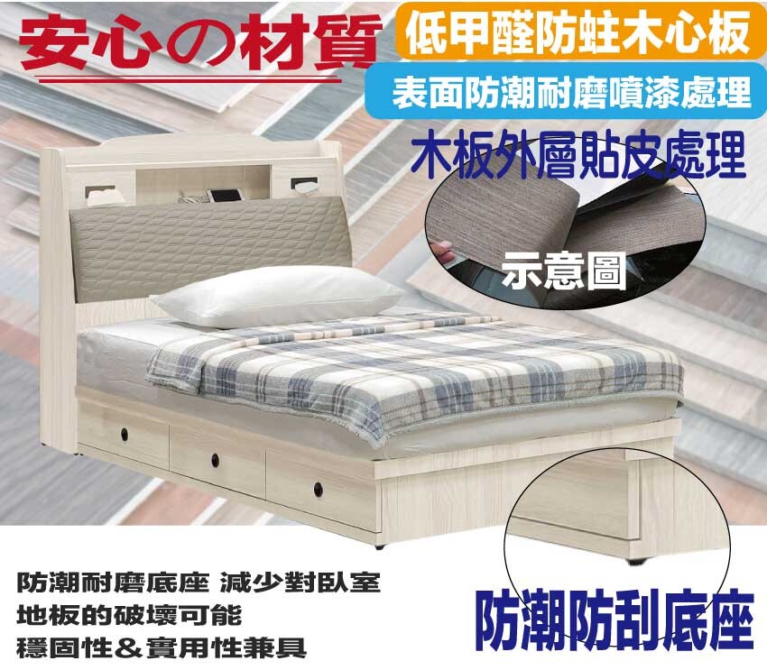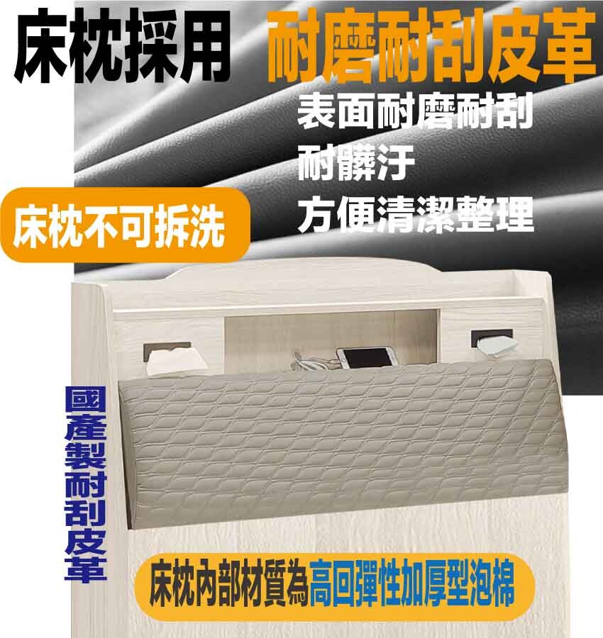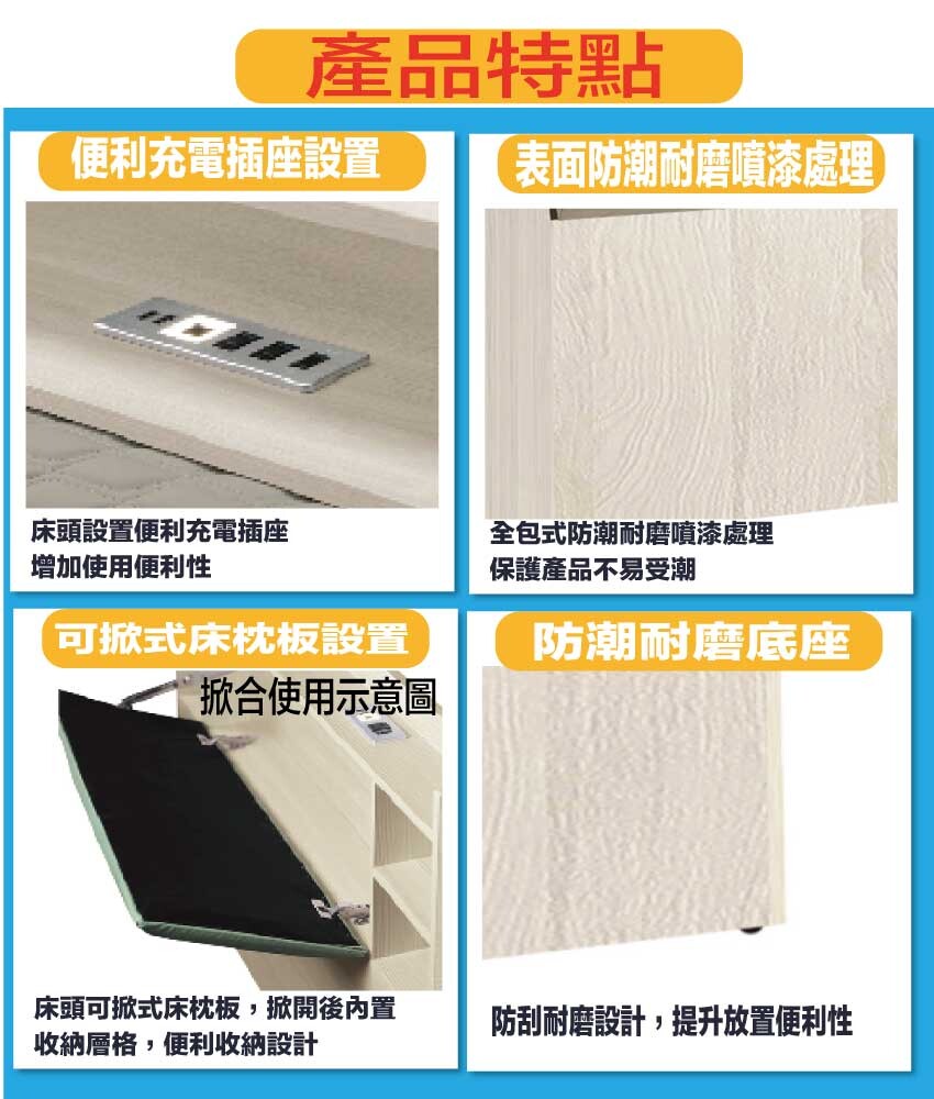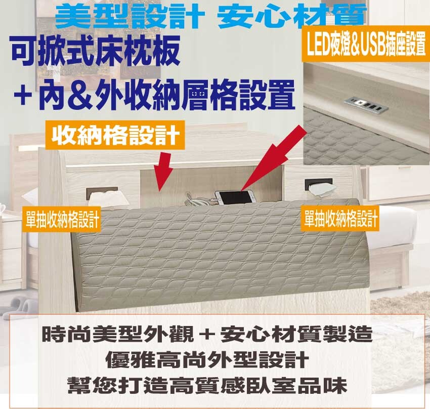 搭配床頭可掀式床枕板+內&外開放收納層格+LED夜燈&USB便利插座設置+床底座單邊開合三抽屜等收納空間設計