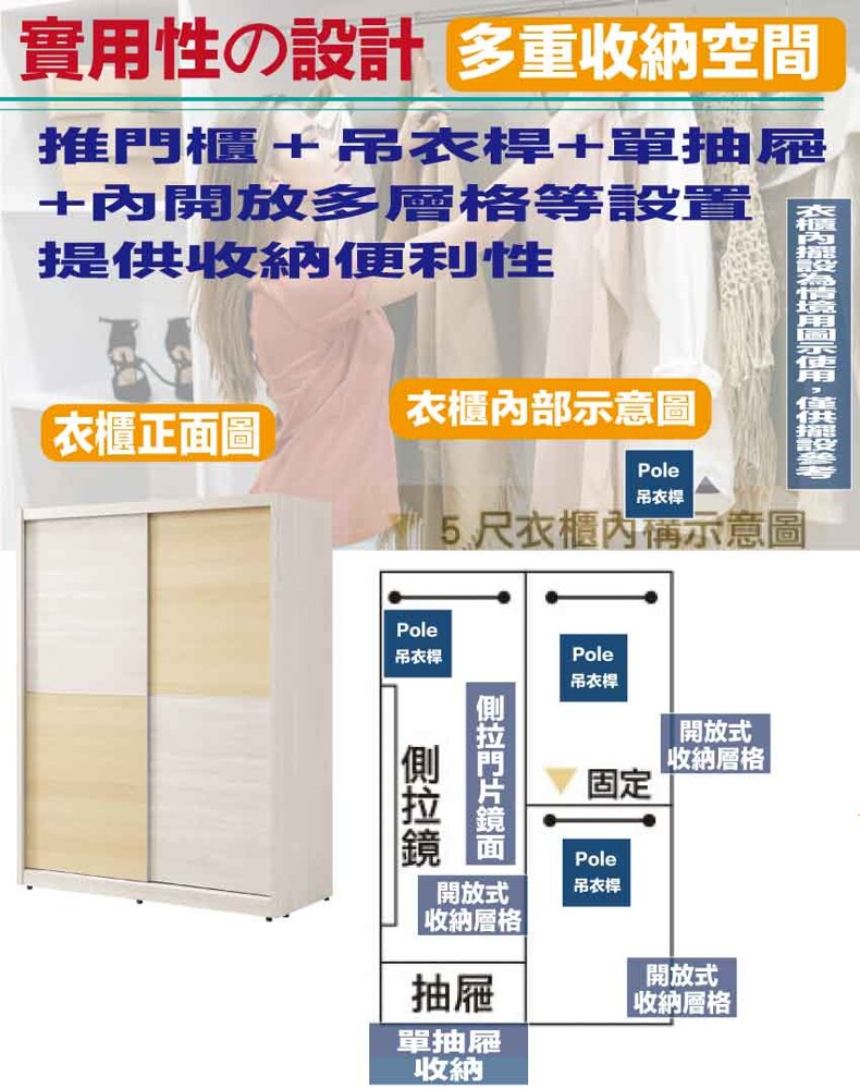搭配採用推門櫃+吊衣桿+單抽屜+側拉鏡面+內開放多層格等收納空間設計
