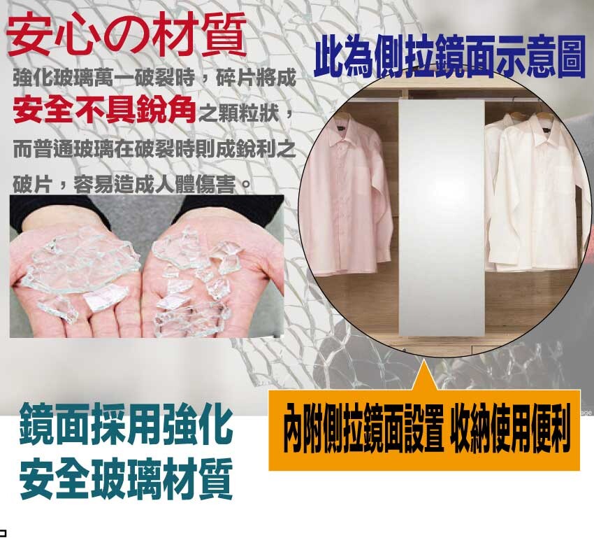 採用防蛀木心板+防潮耐磨底座+五金滑軌結構+強化玻璃鏡面等安心材質製造
