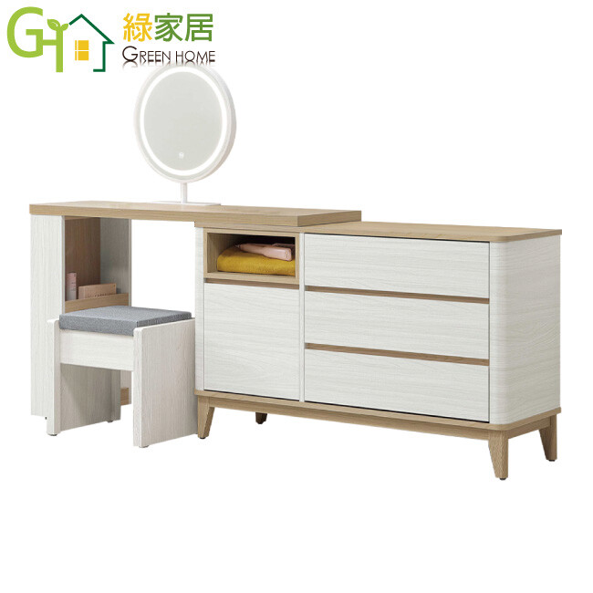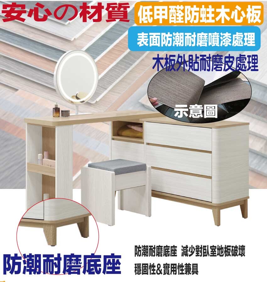【綠家居】哈伊4.5尺觸控鏡面L型可變化鏡台/化妝台組合(含化妝椅) 木紋雙色系+安心材質製造,使用放心+搭配居家更便利,採用防蛀木心板+防潮耐磨底座+五金滑軌結構+強化玻璃鏡面等安心材質製造 ,外層採用防潮耐磨噴漆處理搭配採用觸控鏡面+開門櫃+三抽屜+內&外開放層格等收納空間設計,全由專人配送到家,專業安心服務,替你省下更多時間!