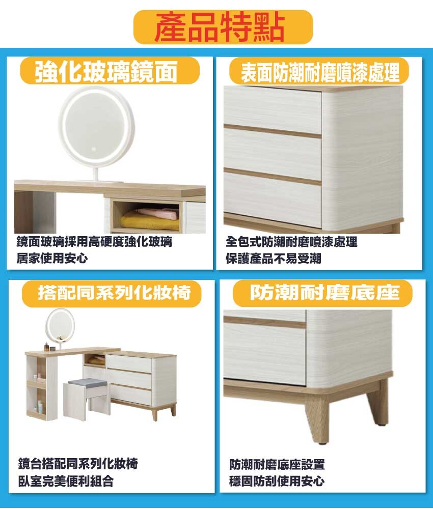 採用防蛀木心板+防潮耐磨底座+五金滑軌結構+強化玻璃鏡面等安心材質製造