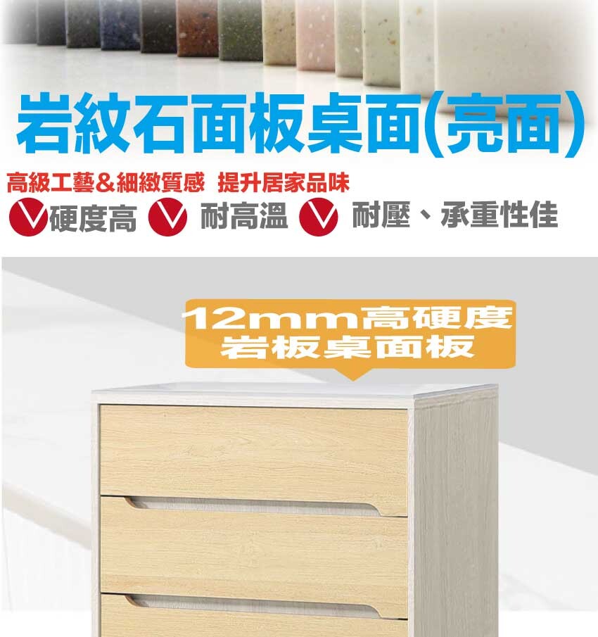 採用防蛀木心板+防潮耐磨底座+五金滑軌結構+松木實木直立腳座+12mm高硬度岩板桌面板等安心材質製造