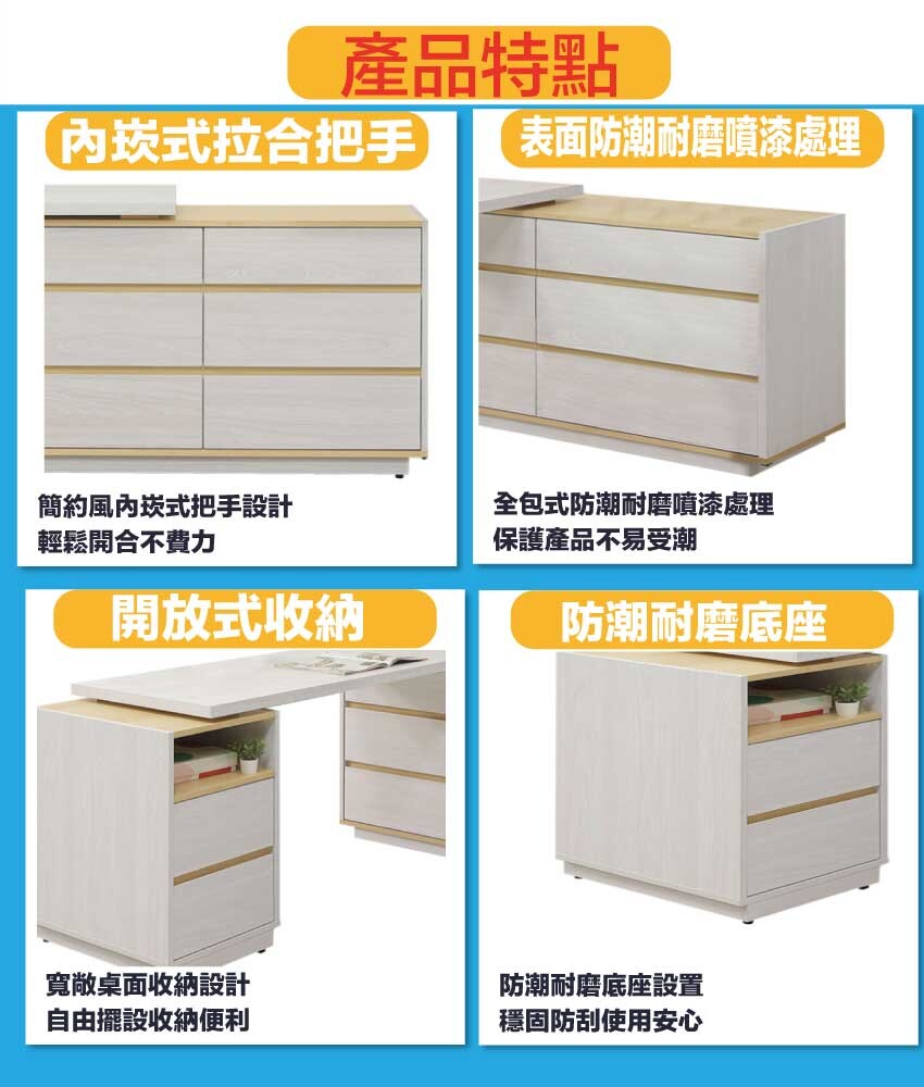 搭配採用八抽屜+可伸縮桌面板+開放層格等收納空間設計