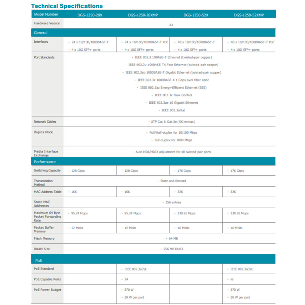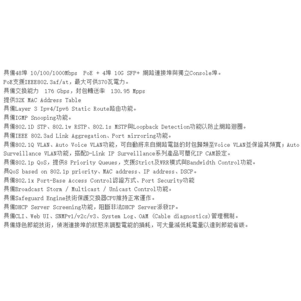 -具備802.1Q VLAN、Auto Voice VLAN功能,可自動將來自網路電話的封包歸類至Voice VLAN並保證其頻寬;Auto Surveillance VLAN功能,搭配D-Link IP Surveillance系列產品可簡化IP CAM設定。