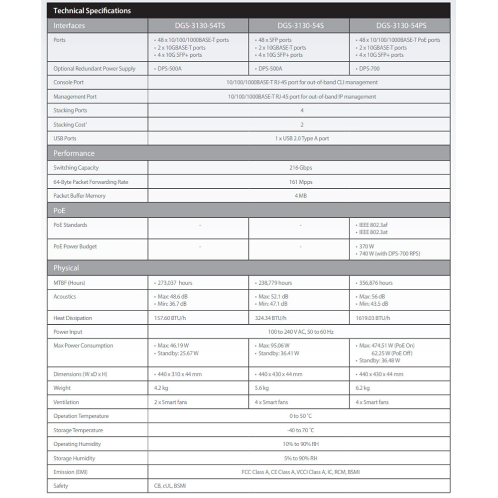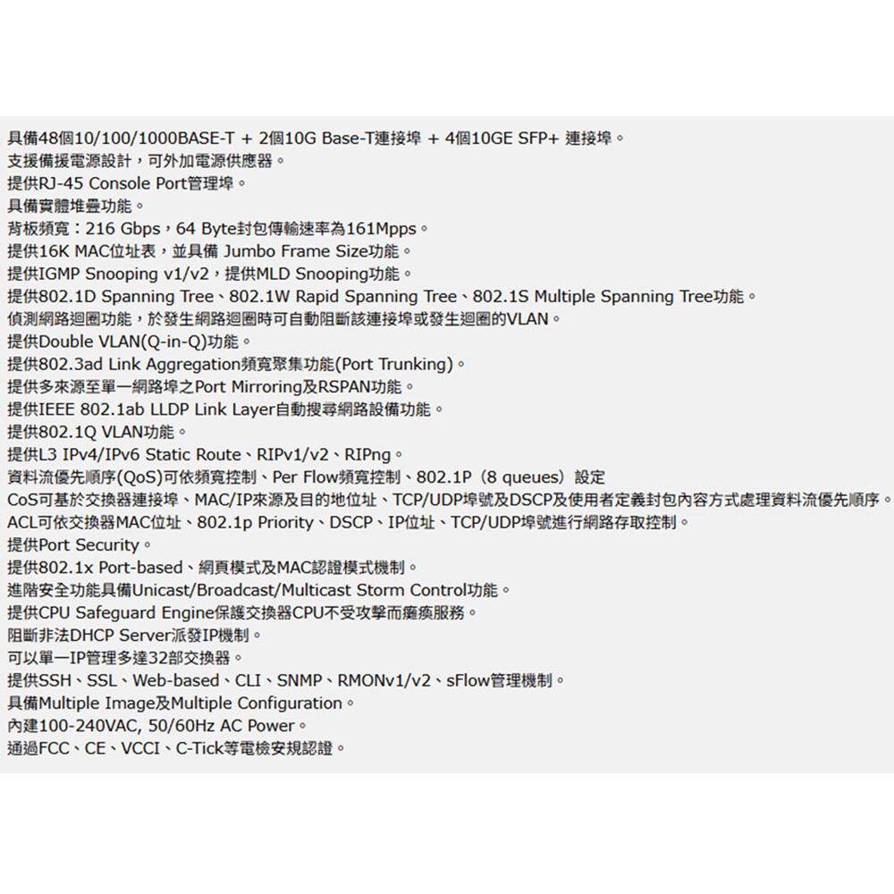 -具備48個10/100/1000BASE-T + 2個10G Base-T連接埠+ 4個10GE SFP+ 連接埠。