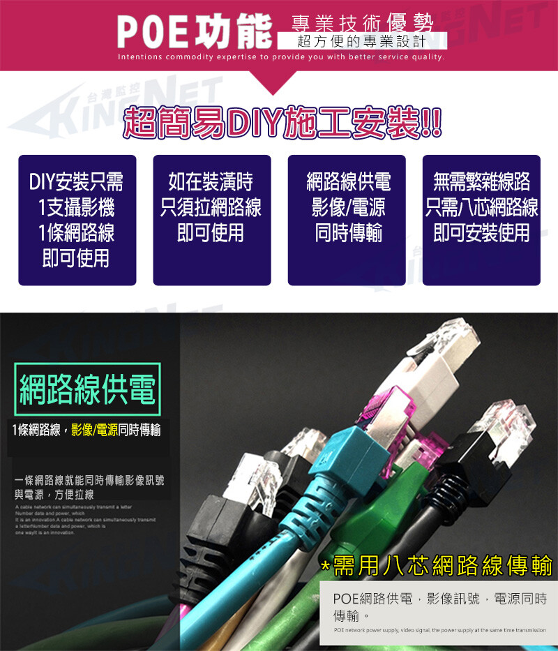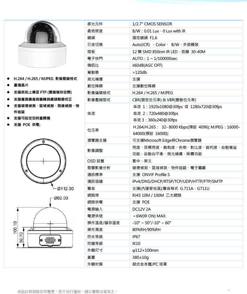 H.264 / H.265 / MJPEG 影像壓縮格式 臺灣晶片 支援抓拍上傳至FTP (雲端儲存空間) 支援畫面鏡像與翻轉與鏡頭畸變校正 支援破壞偵測、區域偵測、跨線偵測、物 件追蹤 支援可設定定時重開機 支援 POE 供電;