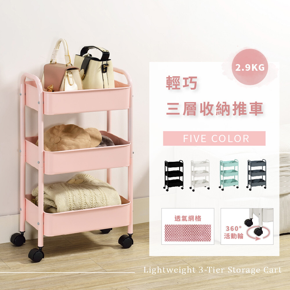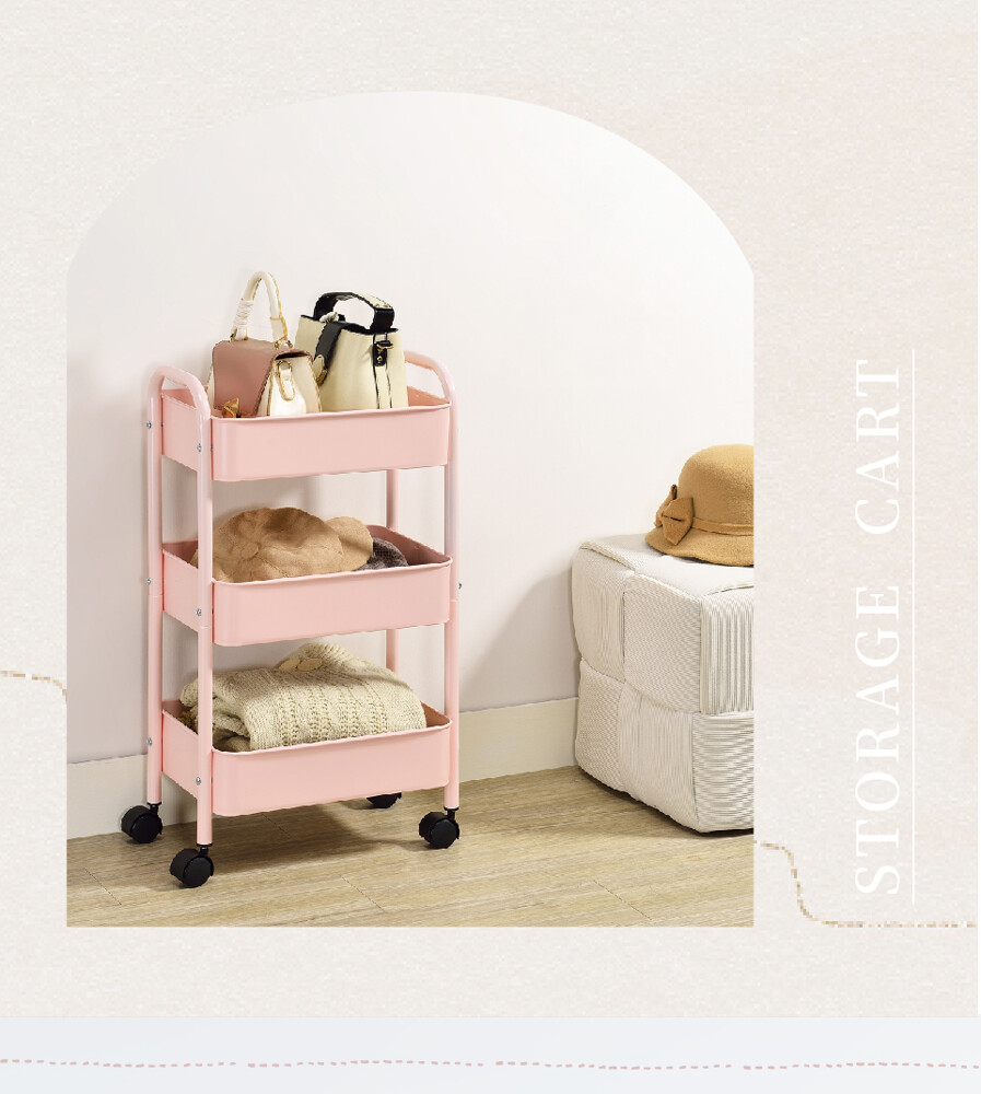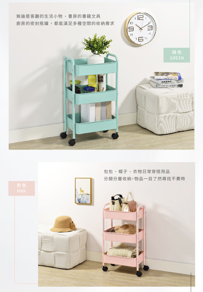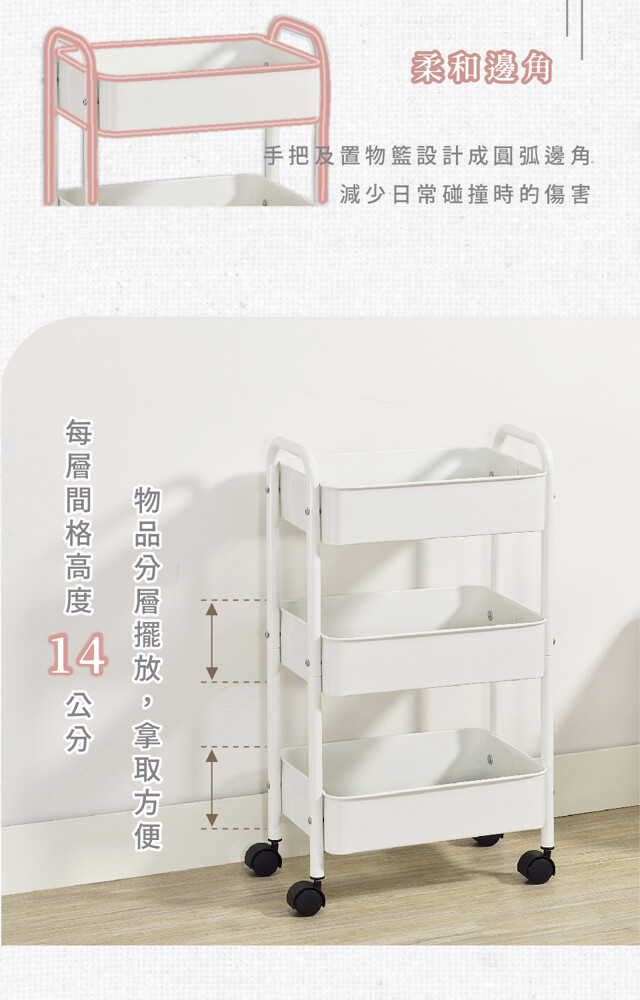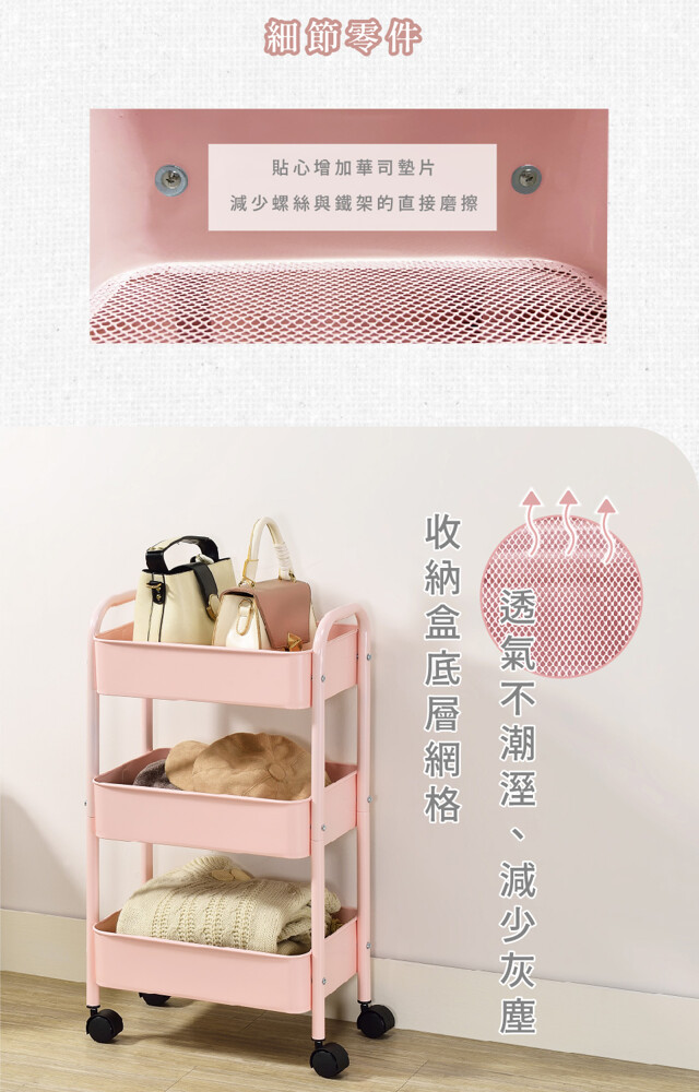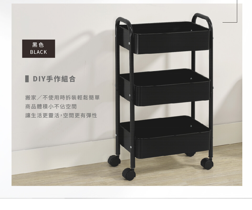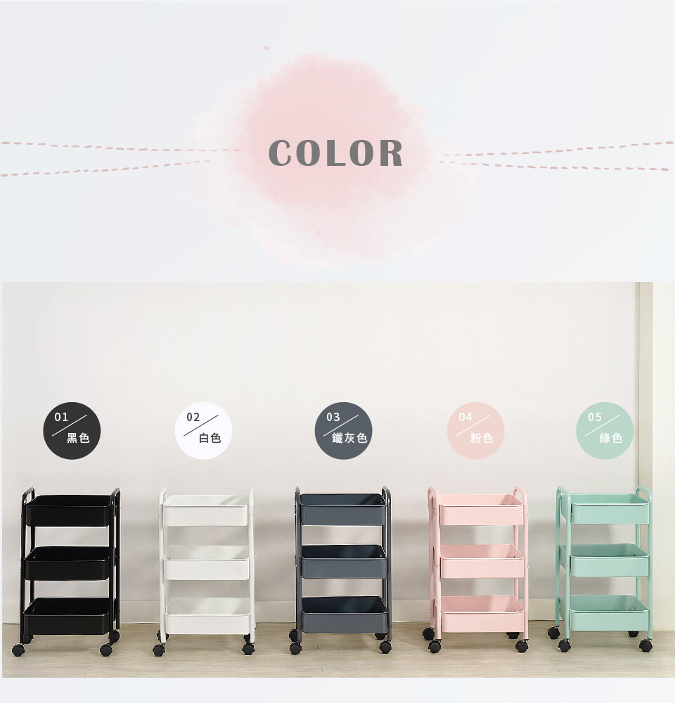 商品材質 : 烤漆鐵管、收納鐵籃、活動輪、塑膠配件
