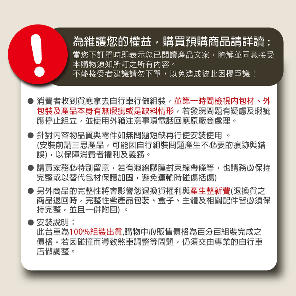 *請注意鑑賞期非試用期,若收到商品經檢察時發現有瑕疵或有任何疑慮時請勿騎乘使用。
