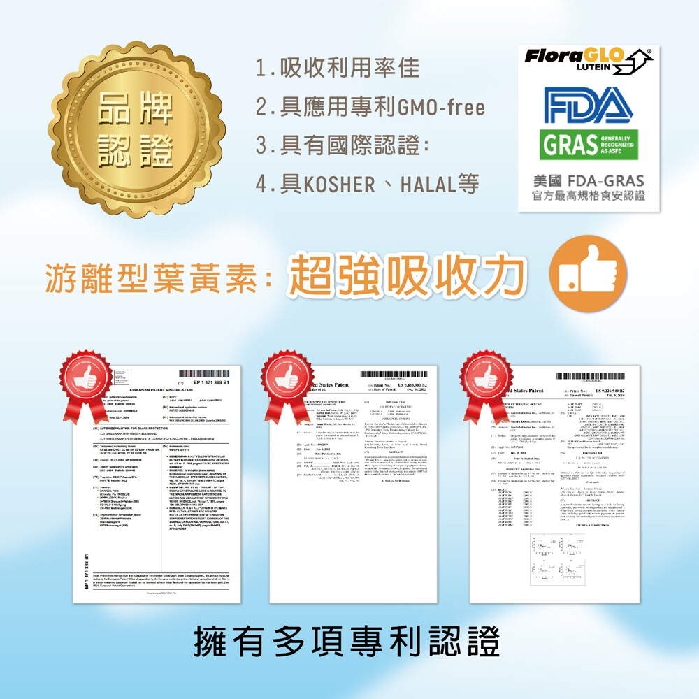 ✅ 專利 FloraGLO® 游離型葉黃素,吸收率高