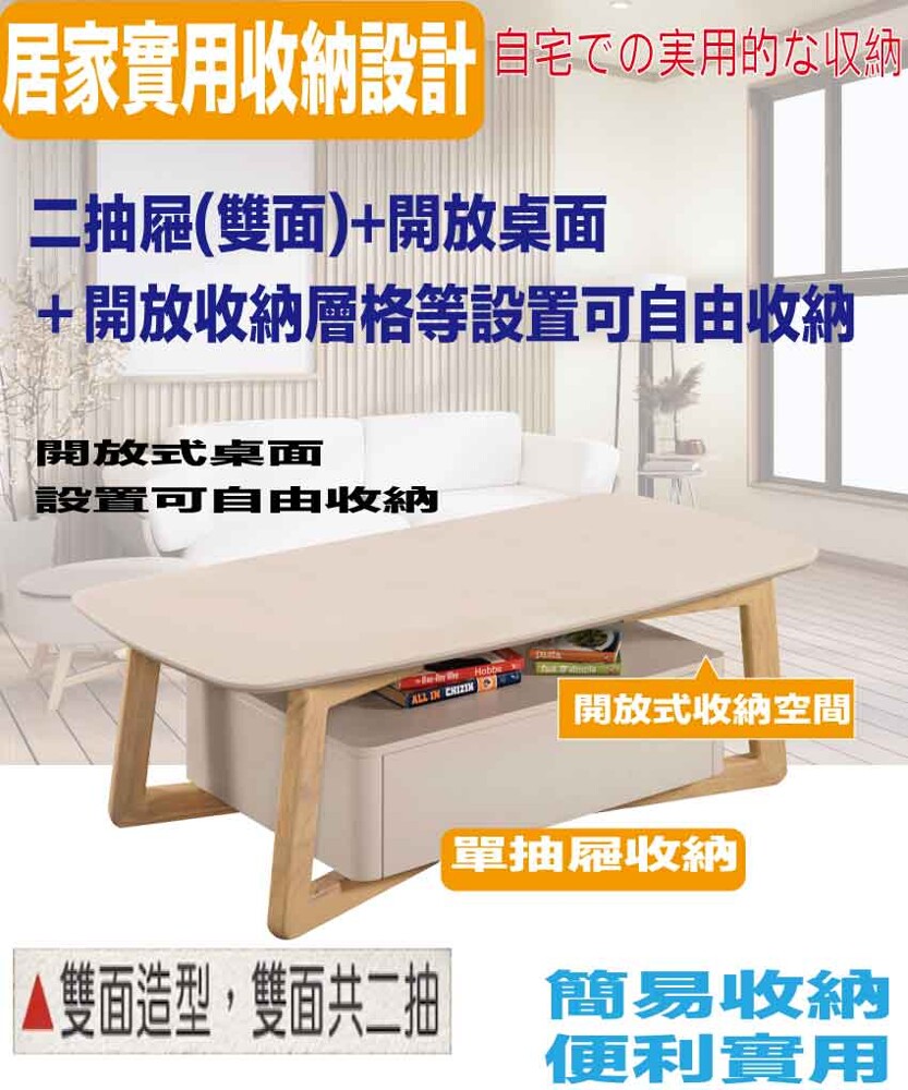 搭配採用雙面開合共二抽屜+開放層格等收納空間設計