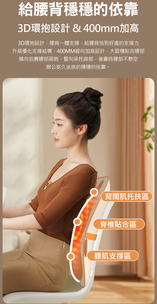 7. 3D環抱設計,400mm加高,腰背一體全部支撐,背闊肌,脊椎,腰肌全部穩穩的支撐住。