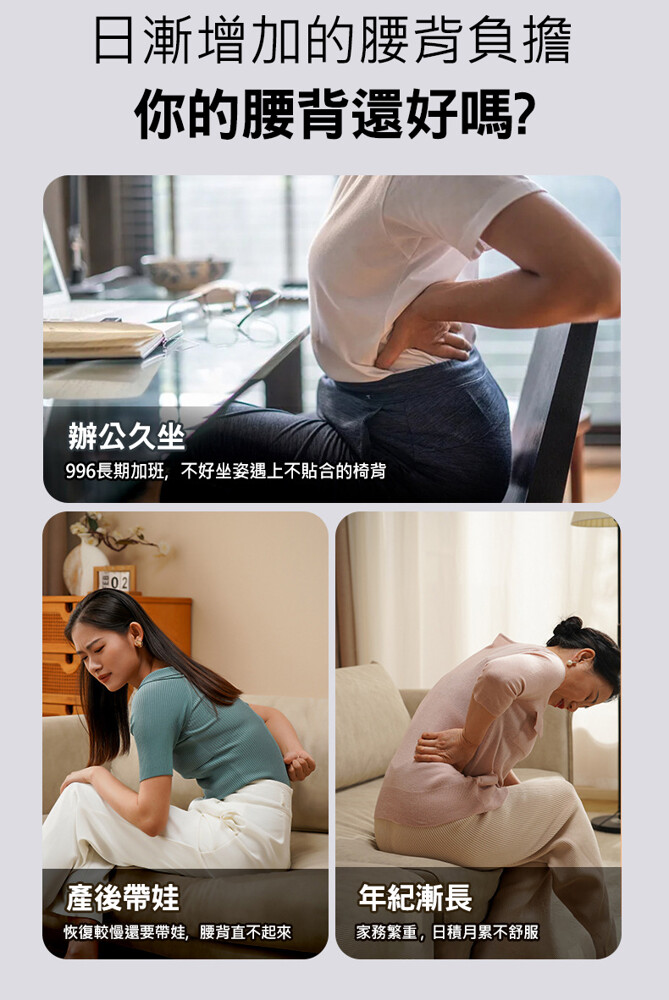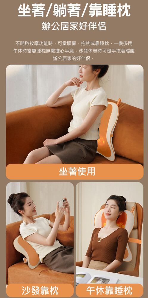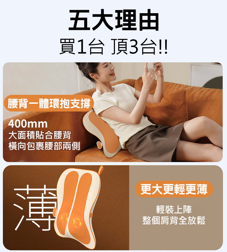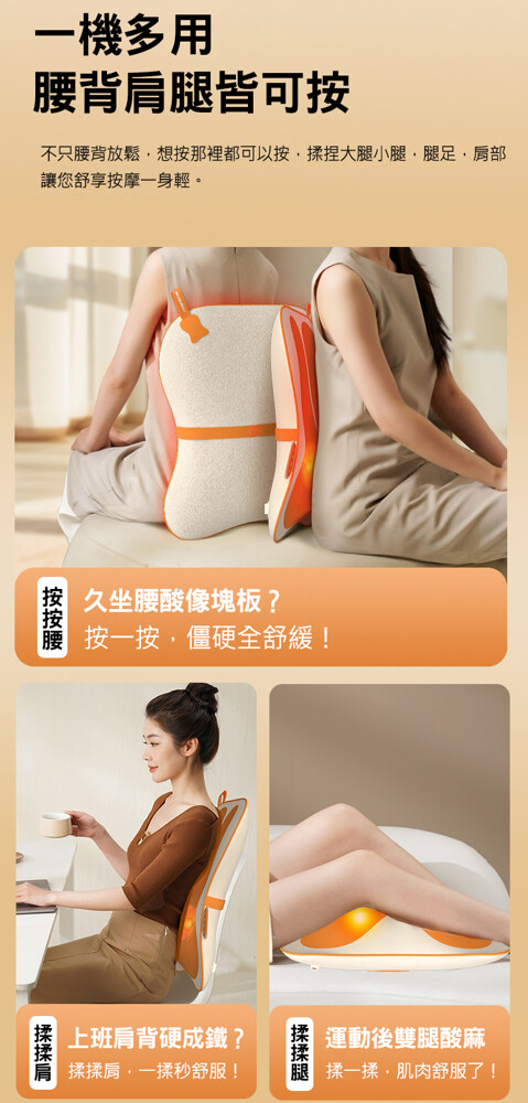 6. 一機多用,不只腰背按摩,大腿小腿,肩背想按哪裡都可以按,一機搞定全身按摩。