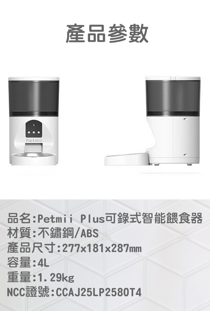 APP遠程操作掌握毛孩進食狀況 自訂定時定量 健康餵養 雙向語音 互動不限距離 材質:不鏽鋼/ABS 產品尺寸:277x181x287mm 容量:4L 重量:1.29kg NCC證號:CCAJ25LP2580T4
