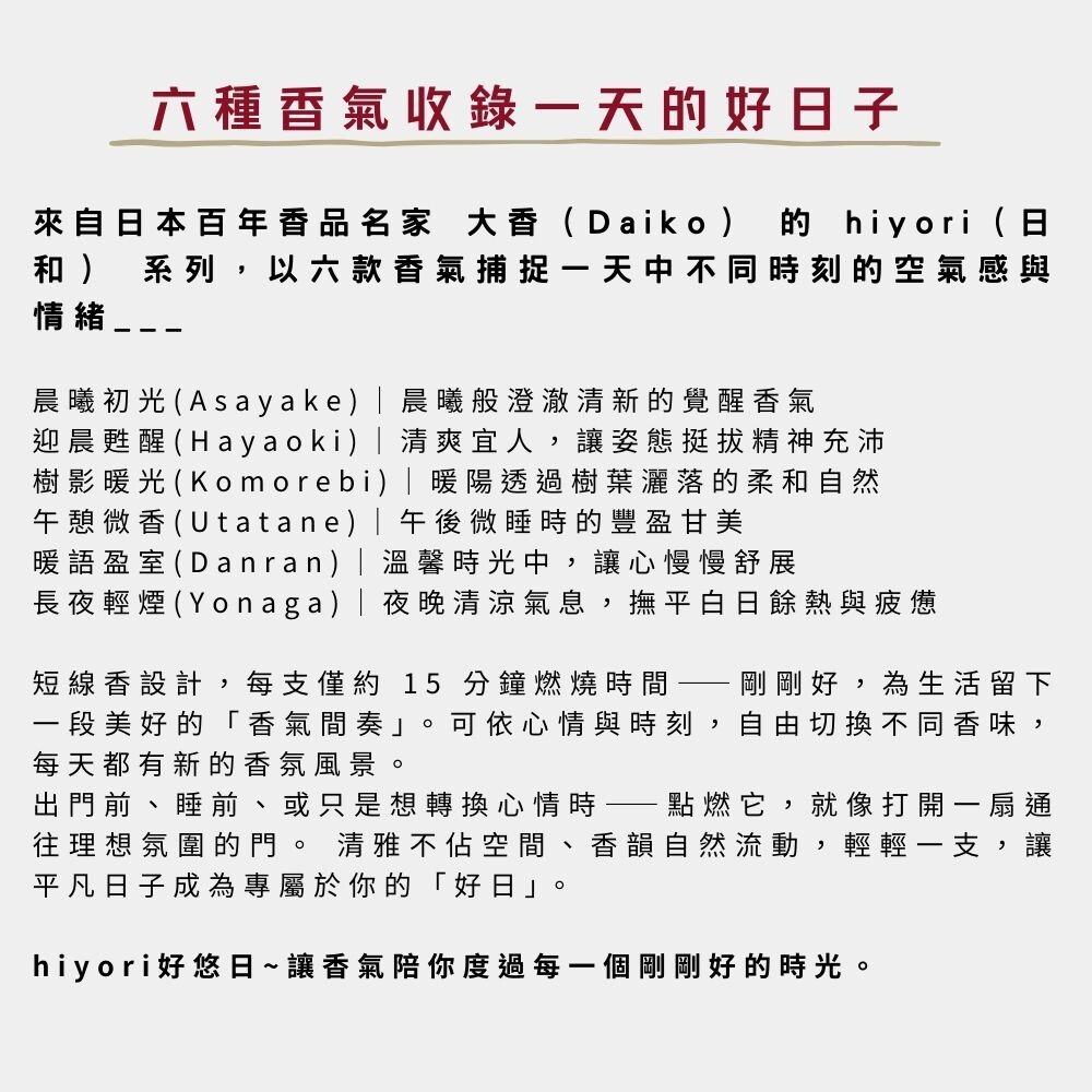 來自日本百年香品名家 大香(Daiko) 的 hiyori(日和) 系列,以六款香氣捕捉一天中不同時刻的空氣感與情緒