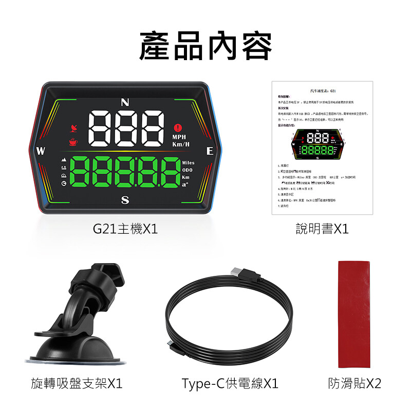 產品內容:G21主機x1、TYPE-C USBx1、防滑墊x2、吸盤支架x1、說明書x1