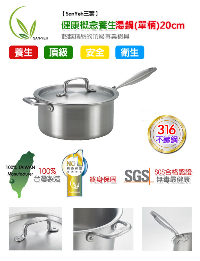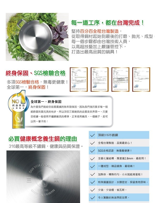 3.三葉鍋具是利用ㄧ體成型的原理,使導熱更均勻,一點熱三點全熱,即360度平均受熱