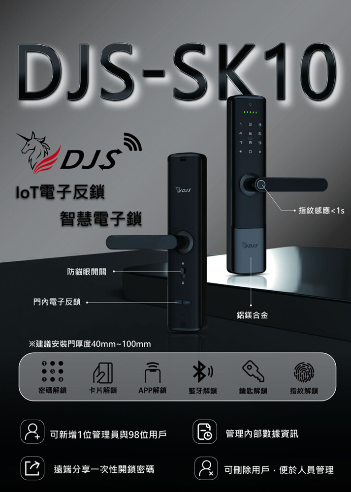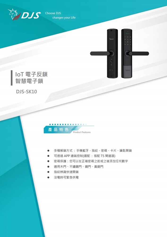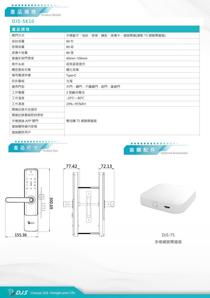 多種解鎖方式 : 手機藍牙、指紋、密碼、卡片、鑰匙開鎖 可透過APP遠端控制(選配 : 搭配T5閘道器) 密碼保護:您可以在正確密碼之前或之後添加任何數字 適用木門、不鏽鋼門、鋼門、黃銅門 指紋辨識快速開鎖 沒電時可緊急供電NCC : CCAH23LP2110T9