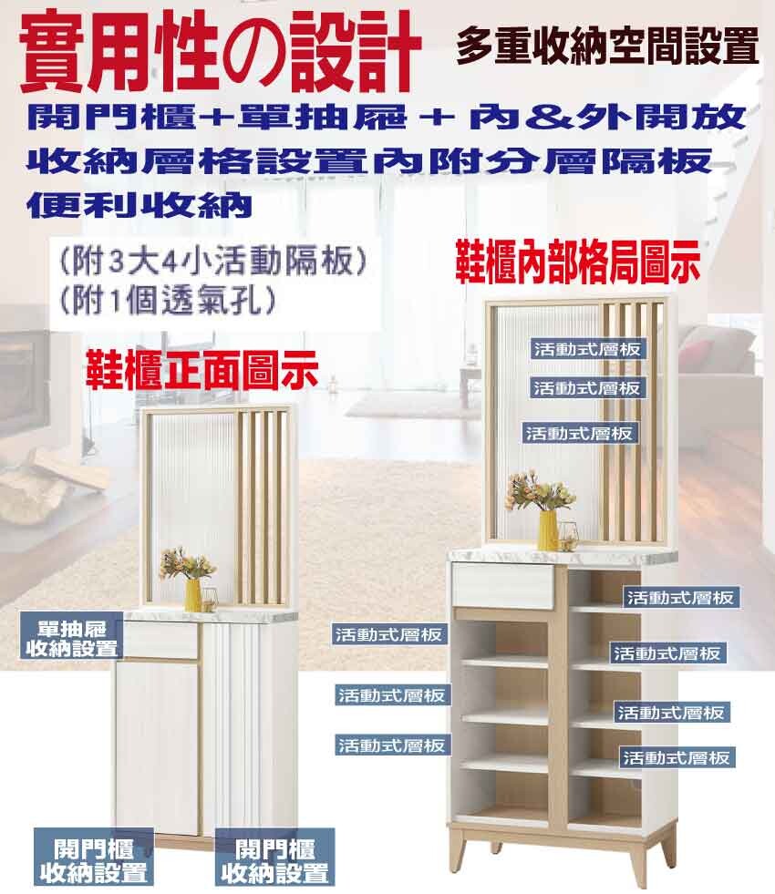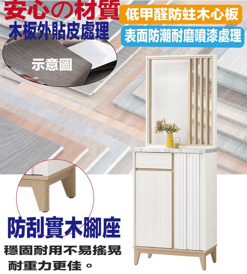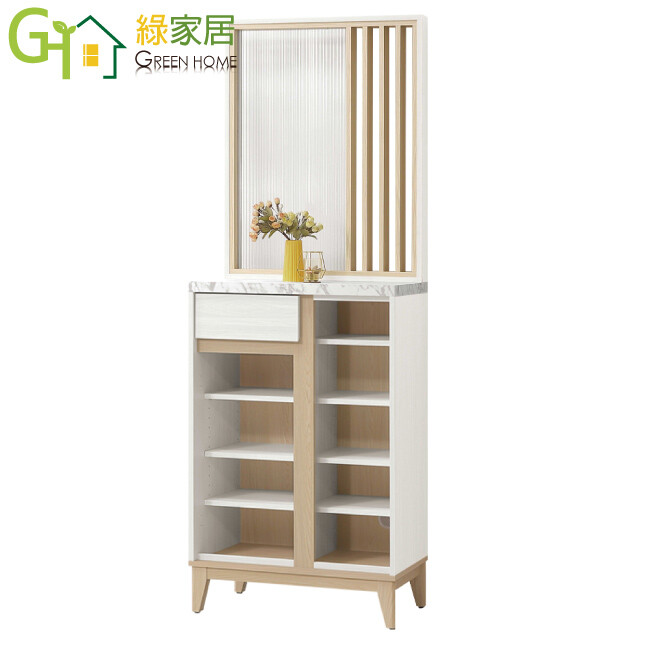 【綠家居】亞畢克2.3尺二門單抽玻璃屏風高玄關櫃 現代雙色系+安心材質製造,使用放心+搭配居家更便利,採用防蛀木心板+防刮實木腳座+五金滑軌結構+5mm長虹直紋玻璃+仿大理石紋耐磨美耐皿材質桌面板等安心材質製造 ,外層採用防潮耐磨噴漆處理搭配採用開門櫃+單抽屜+內&外開放層格等收納空間設計,全由專人配送到家,專業安心服務,替你省下更多時間!