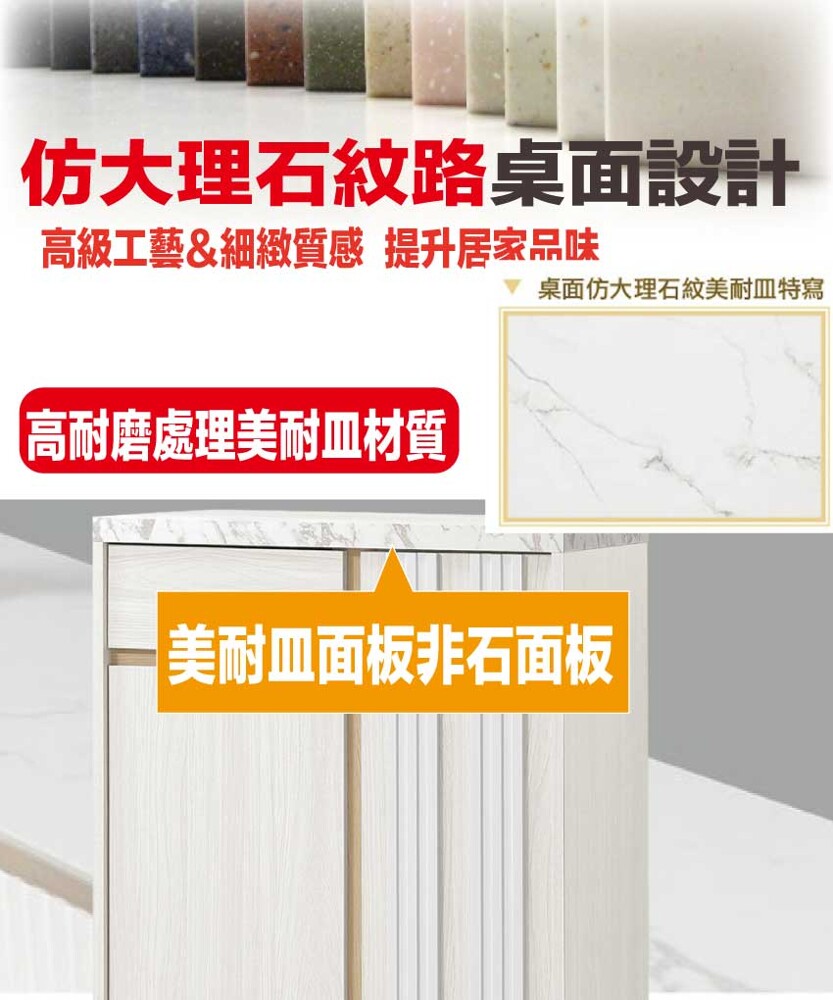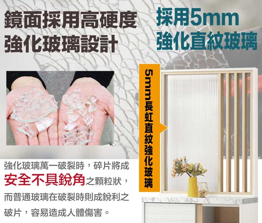 採用防蛀木心板+防刮實木腳座+五金滑軌結構+仿大理石紋耐磨美耐皿材質桌面板+5mm長虹直紋玻璃等安心材質製造