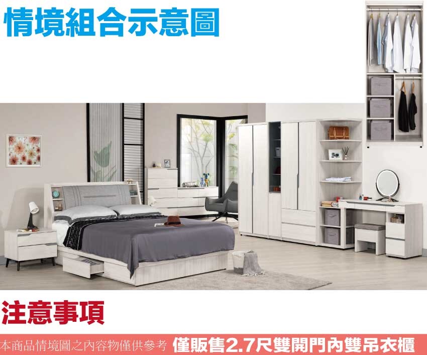 搭配採用開門櫃+吊衣桿+內開放層格等收納空間設計
