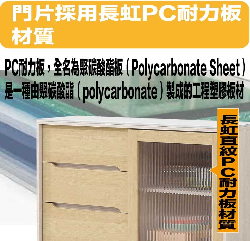 採用防蛀木心板+防刮實木腳座+五金滑軌結構+5mm長虹直紋PC耐力板等安心材質製造