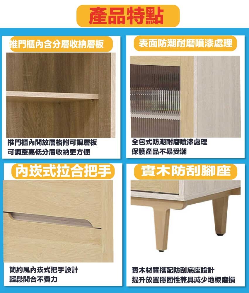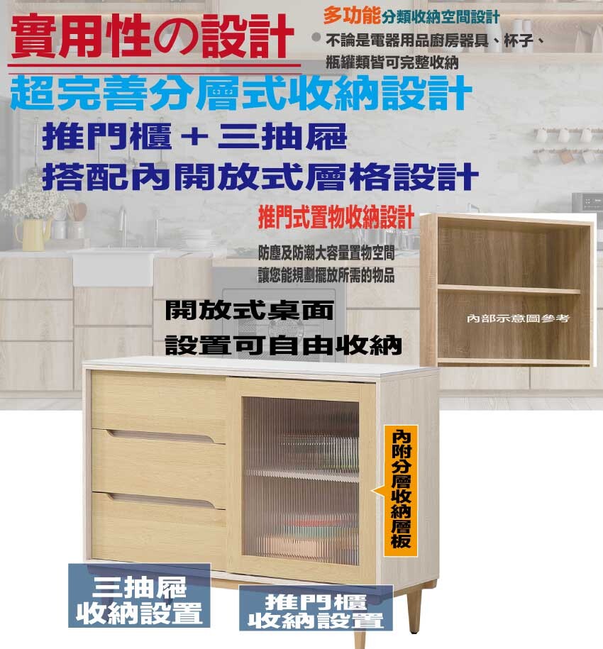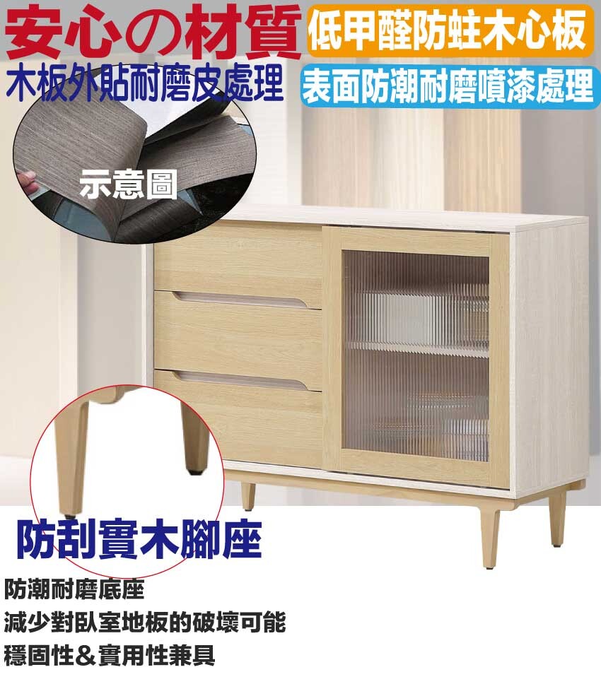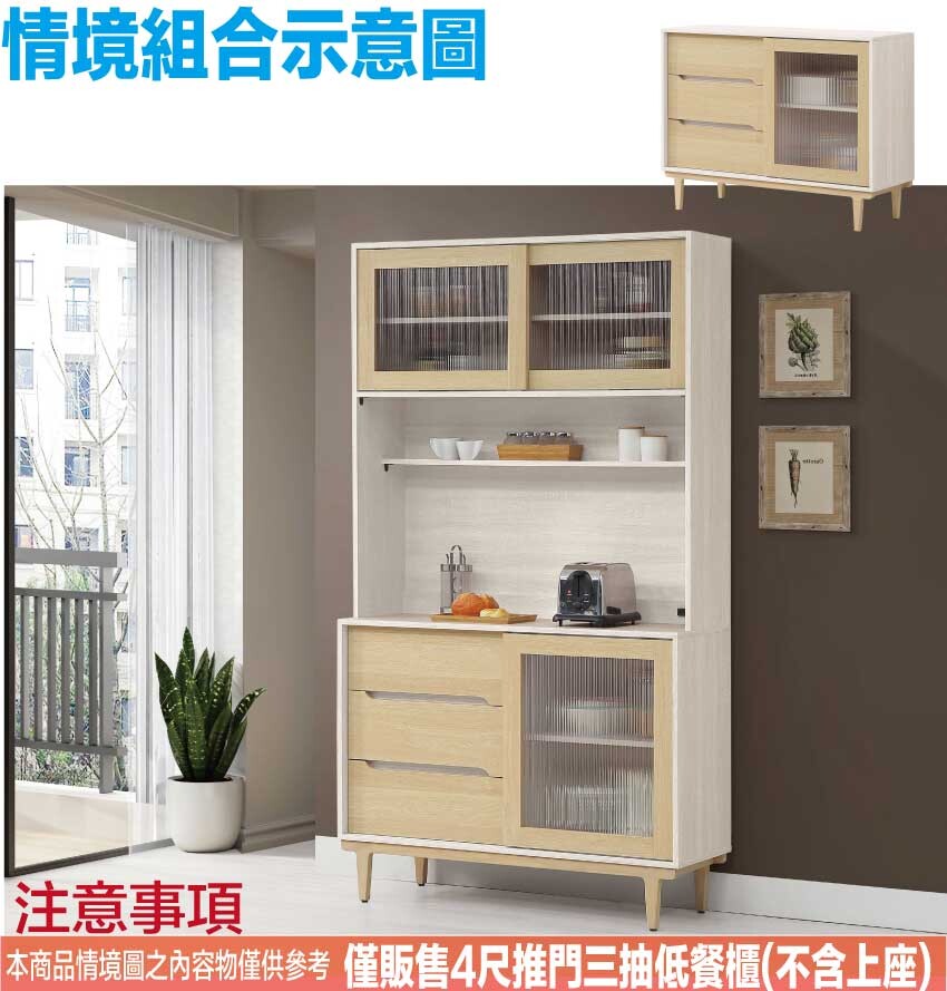 【綠家居】菲可雙色4尺推門三抽餐櫃 現代雙色系+安心材質製造,使用放心+搭配居家更便利,採用防蛀木心板+防刮實木腳座+五金滑軌結構+5mm長虹直紋PC耐力板等安心材質製造 ,外層採用防潮耐磨噴漆處理搭配採用推門櫃+三抽屜+內開放層格等收納空間設計,全由專人配送到家,專業安心服務,替你省下更多時間!