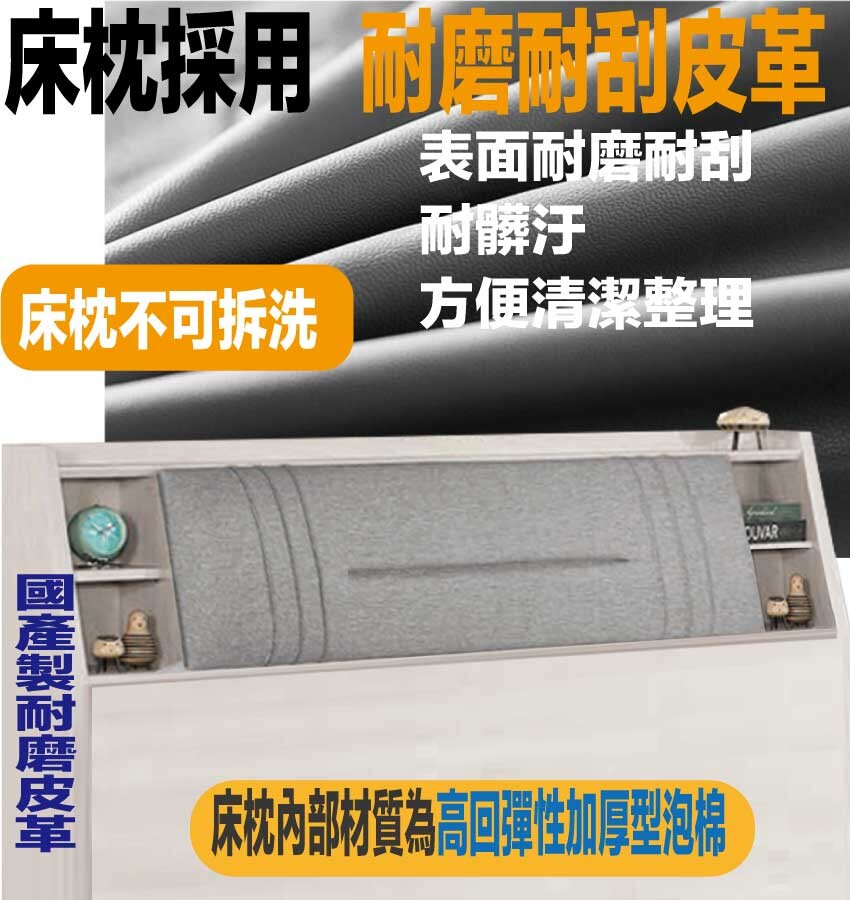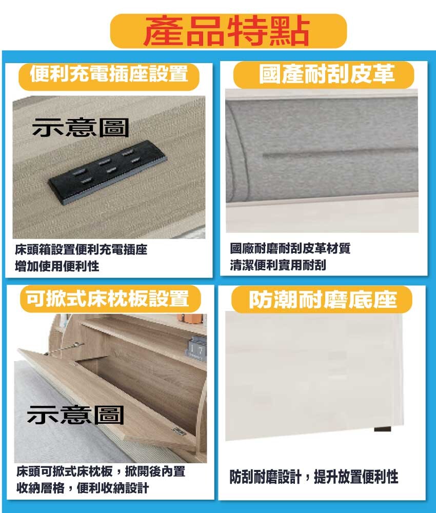 採用防蛀木心板+防潮耐磨底座+耐磨耐刮皮革+高回彈泡棉等安心材質製造