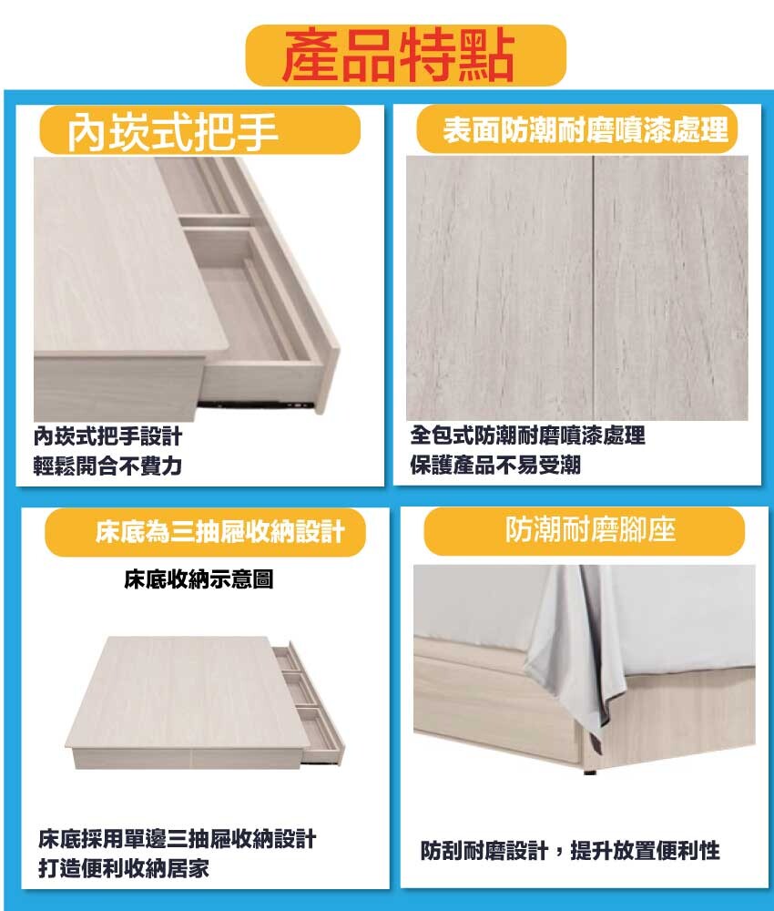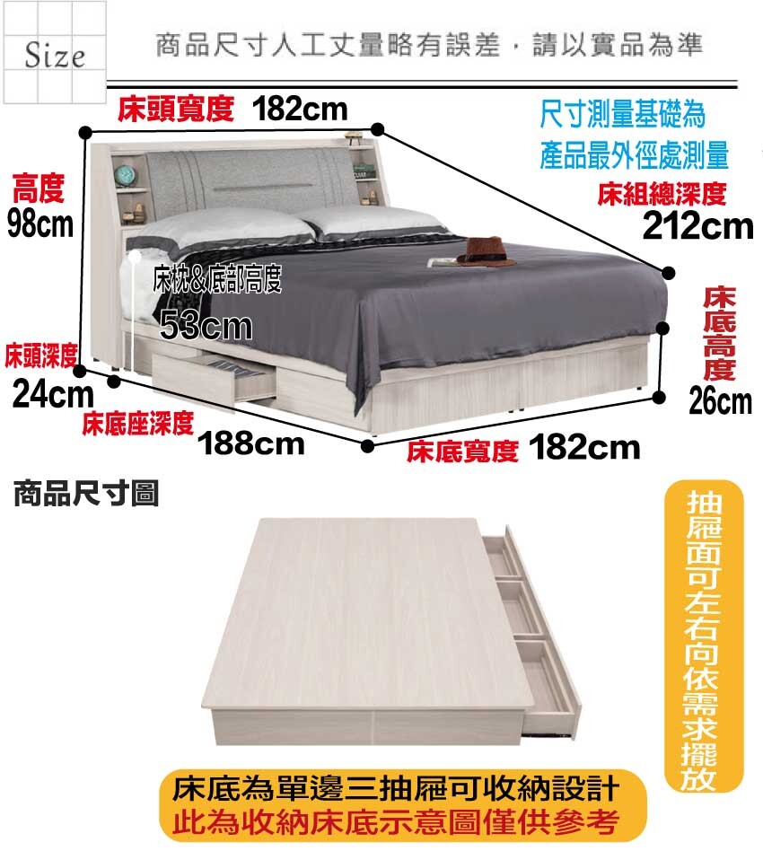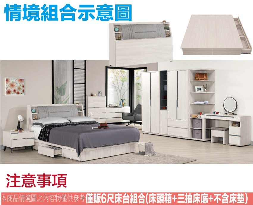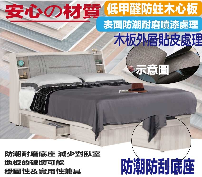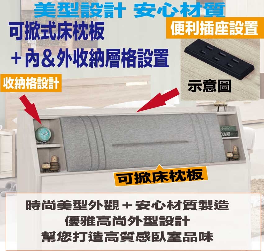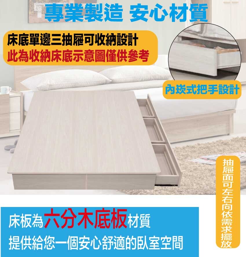 搭配床頭可掀式床枕板+內&外開放層格+便利插座設置+床底座單邊開合三抽屜等收納空間設計