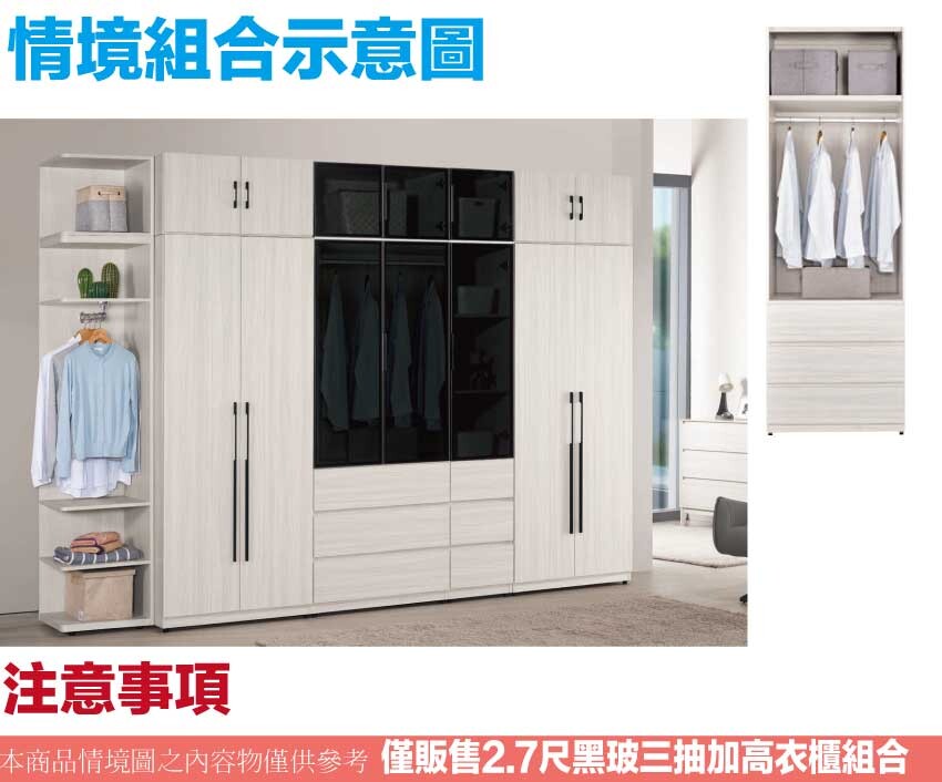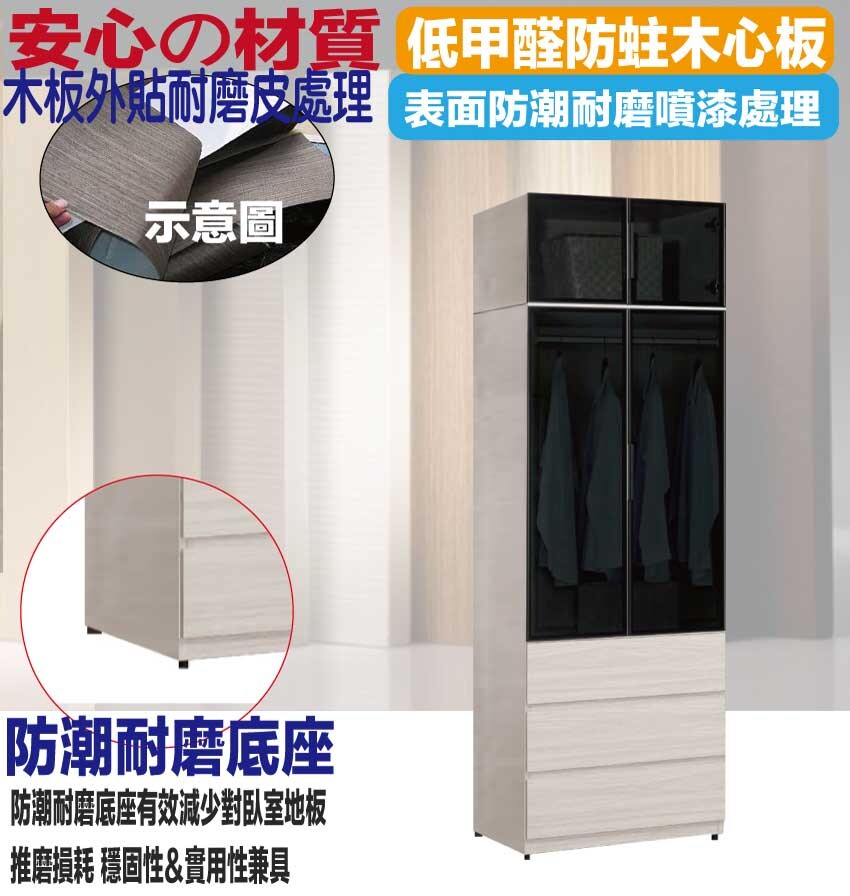 【綠家居】朵利2.7尺鋁門黑玻三抽加高衣櫃組合 木紋雙色系+安心材質製造,使用放心+搭配居家更便利,採用防蛀木心板+防潮耐磨底座+防夾手緩衝門片五金+五金滑軌結構+鋁製黑漆邊框+5mm強化黑玻璃等安心材質製造 ,外層採用防潮耐磨噴漆處理搭配採用開門櫃+吊衣桿+三抽屜+內開放層格等收納空間設計,全由專人配送到家,專業安心服務,替你省下更多時間!