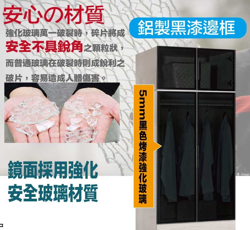 採用防蛀木心板+防潮耐磨底座+防夾手緩衝門片五金+五金滑軌結構+鋁製黑漆邊框+5mm強化黑玻璃等安心材質製造
