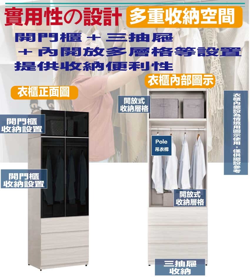 搭配採用開門櫃+吊衣桿+三抽屜+內開放層格等收納空間設計