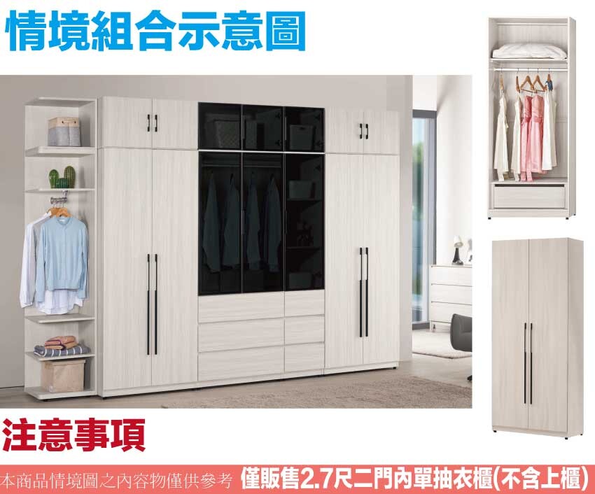 搭配採用開門櫃+吊衣桿+單抽屜+內開放層格等收納空間設計