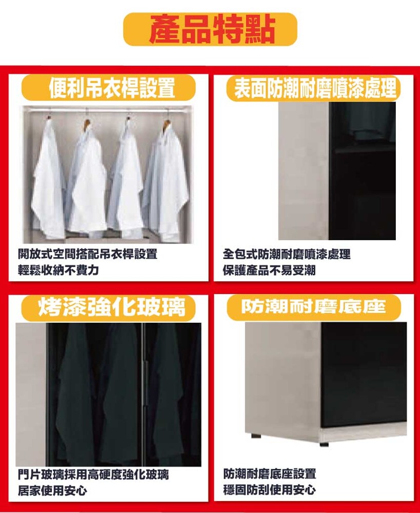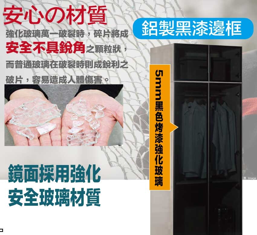 採用防蛀木心板+防潮耐磨底座+防夾手緩衝門片五金+鋁製黑漆邊框+5mm強化黑玻璃等安心材質製造