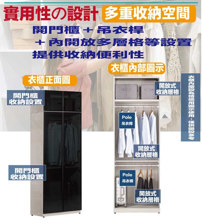搭配採用開門櫃+吊衣桿+內開放層格等收納空間設計