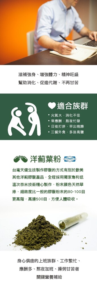 台灣天健法國百合(洋薊)養生膠囊的製作方式有別於歐美其他洋薊產品,全程採用獨家專利低溫次奈米技術精心製作,粉末顏色天然翠綠,細緻度比一般的膠囊粉末的80-100目更高階,高達500目,易人體吸收,首創低溫乾燥製程,保證最大部分天然有效活性成份的來源,純植物製作無任何添加物,