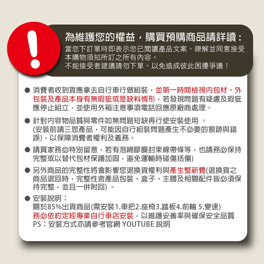 ● 此台車為85%組裝出貨,請將車拿至單車店交由專業人員組裝!(龍頭、前輪、左右煞車、變速等到貨時待調整)