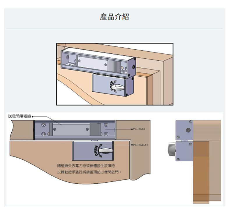 緊急陽極鎖開鎖器外掛盒係裝置於陽極鎖配合之門板上,以便於陽極鎖失去電力時開啟或鎖體發生故障時以轉動把手開啟。 當使用斷電不開門之安全型陽極鎖於失去電力時為求緊急開門,則必須輔以此裝置,以便不時之需。 PG-B64K1可直接安裝於內側門板上,提高了安裝的便利性,並可依需求安裝外掛於各式門板上。